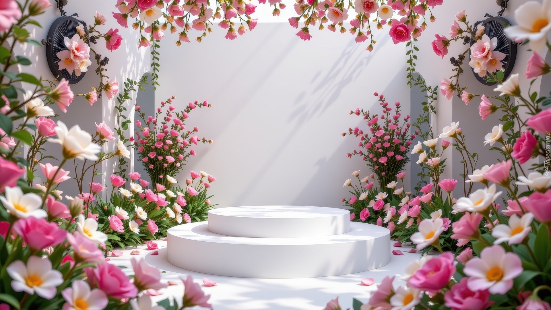 Edytor tapety: Białe i różowe kwiaty wokół podium