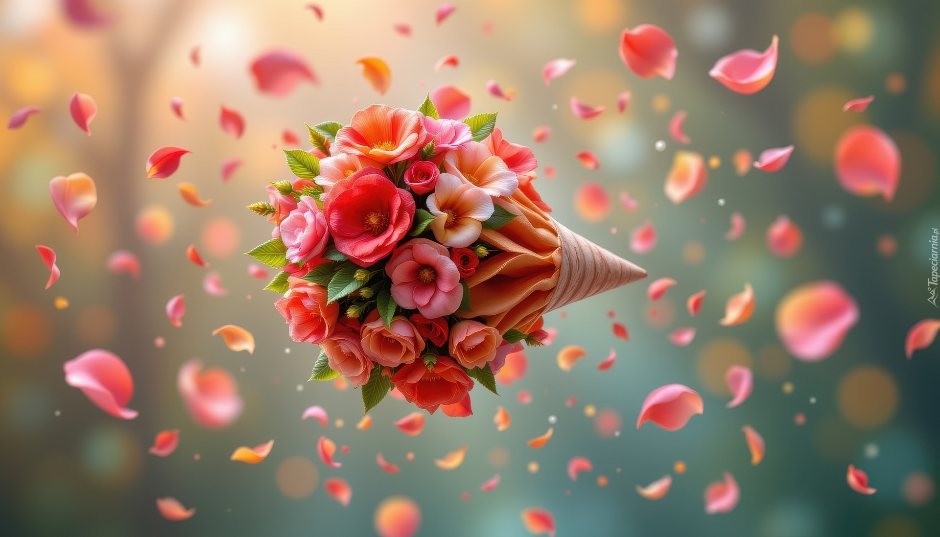 Edytor tapety: Bukiet kwiatów w rożku wśród wirujących płatków