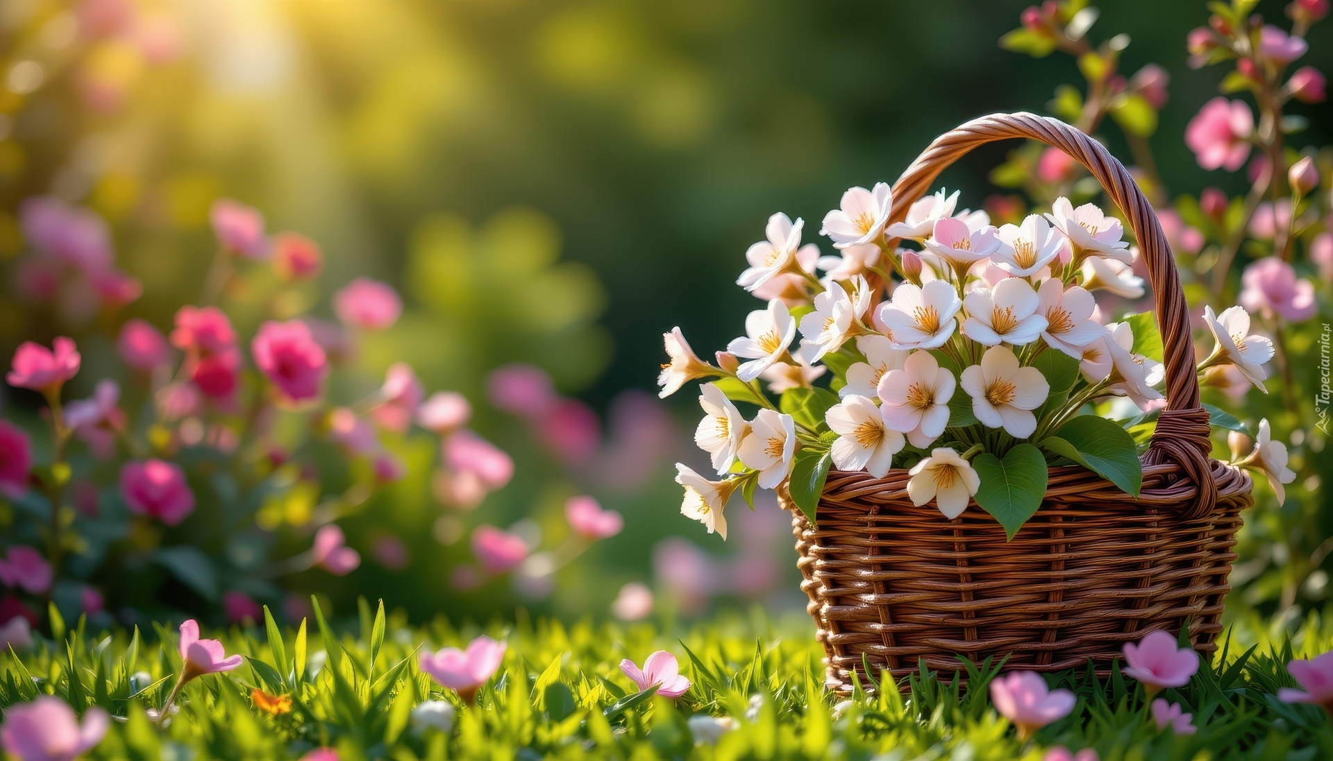 Edytor tapety: Wiklinowy koszyk z białymi kwiatami na trawie