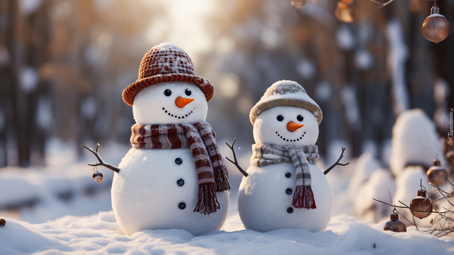 Edytor tapety: Dwa bałwanki w brązowych czapkach i szalikach