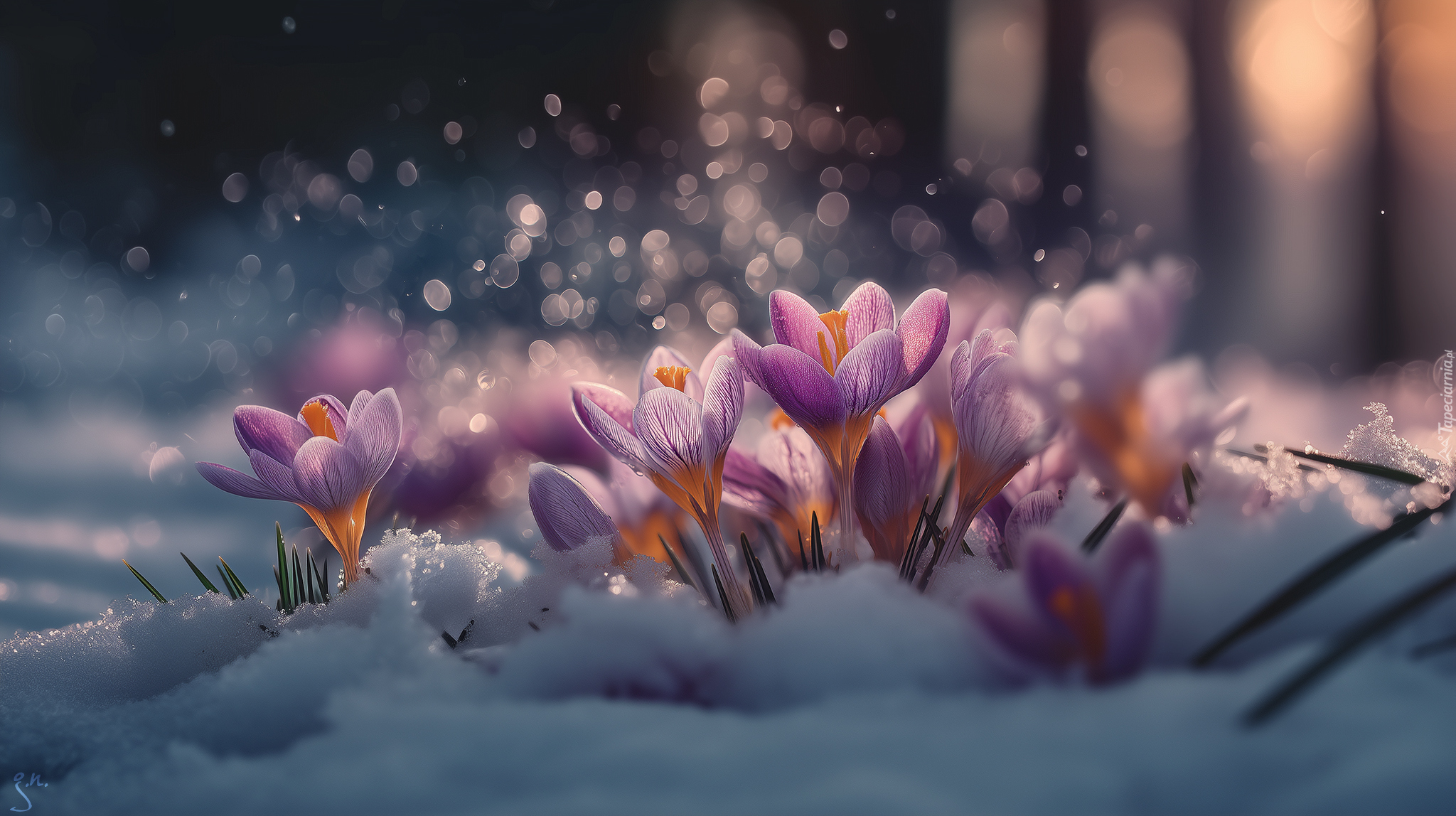 Edytor tapety: Rozświetlone fioletowe krokusy wystające ze śniegu