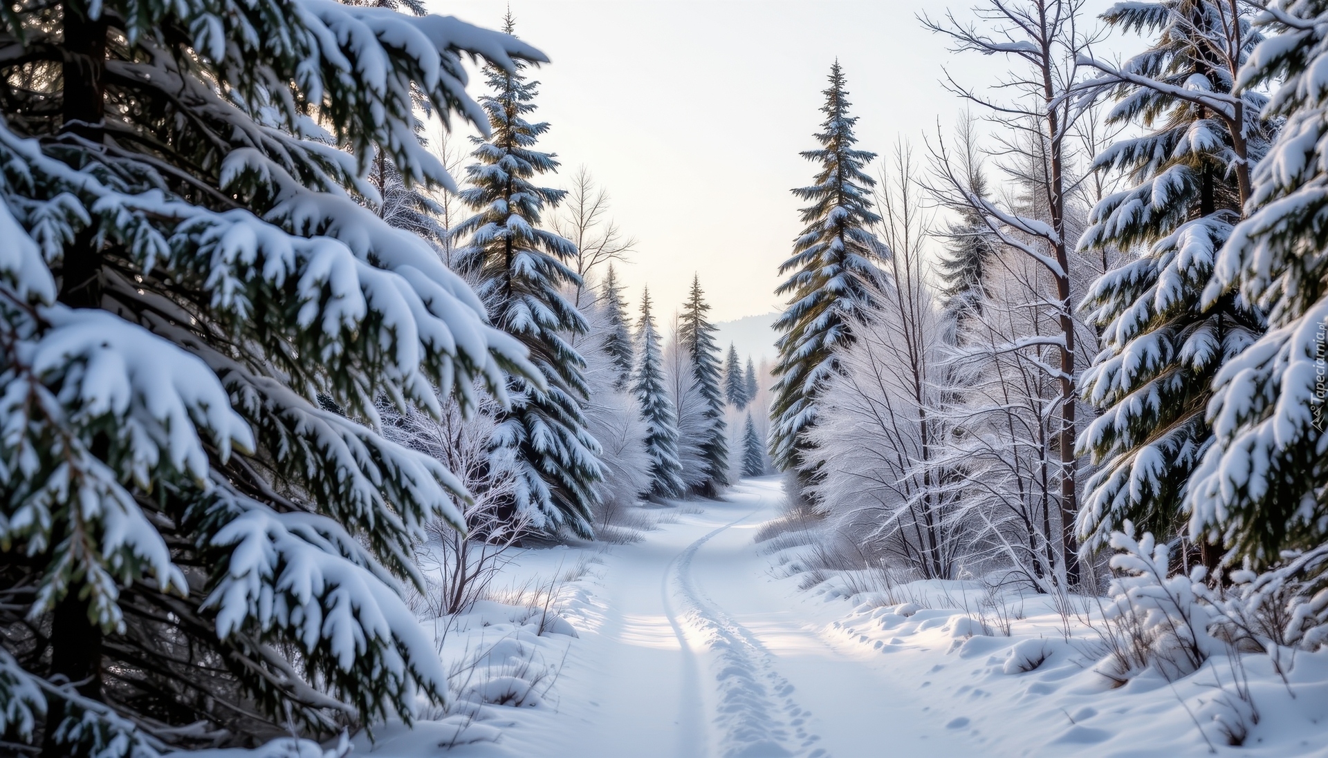 Edytor tapety: Zaśnieżona droga między ośnieżonymi drzewami w lesie