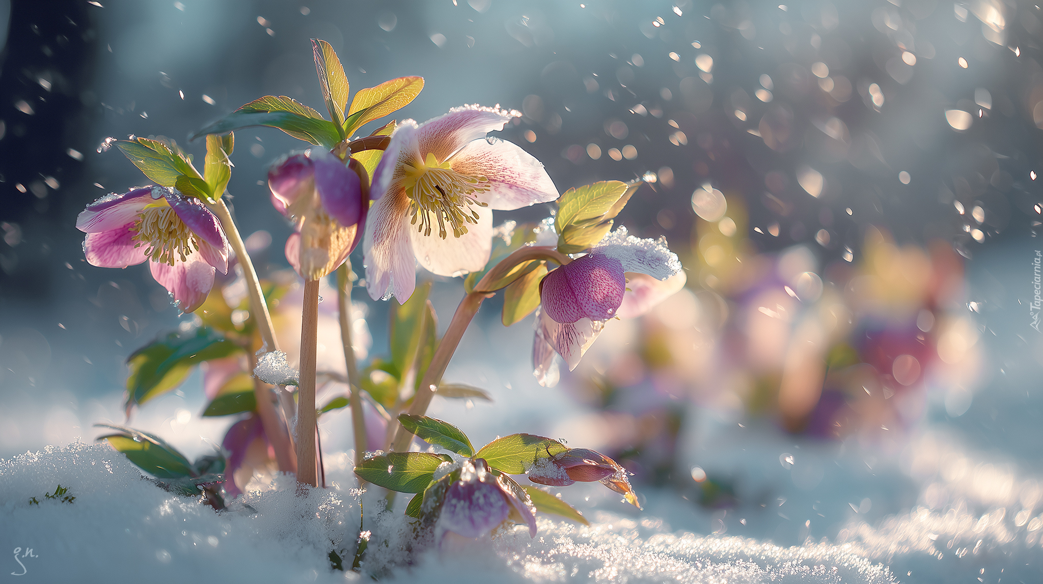 Edytor tapety: Różowe ciemierniki kwitnące na śniegu