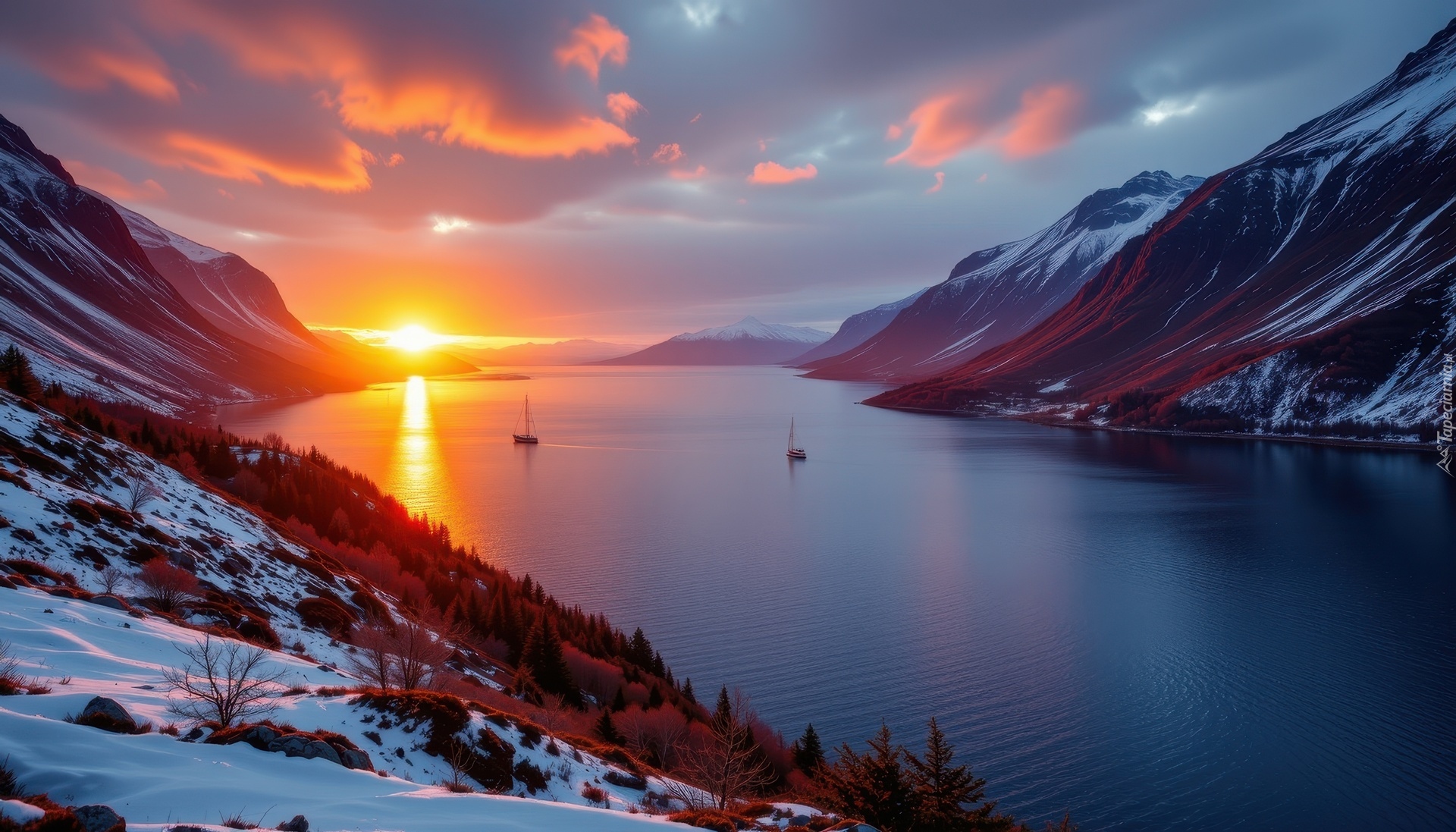 Edytor tapety: Ośnieżone góry i rzeka w blasku zachodzącego słońca