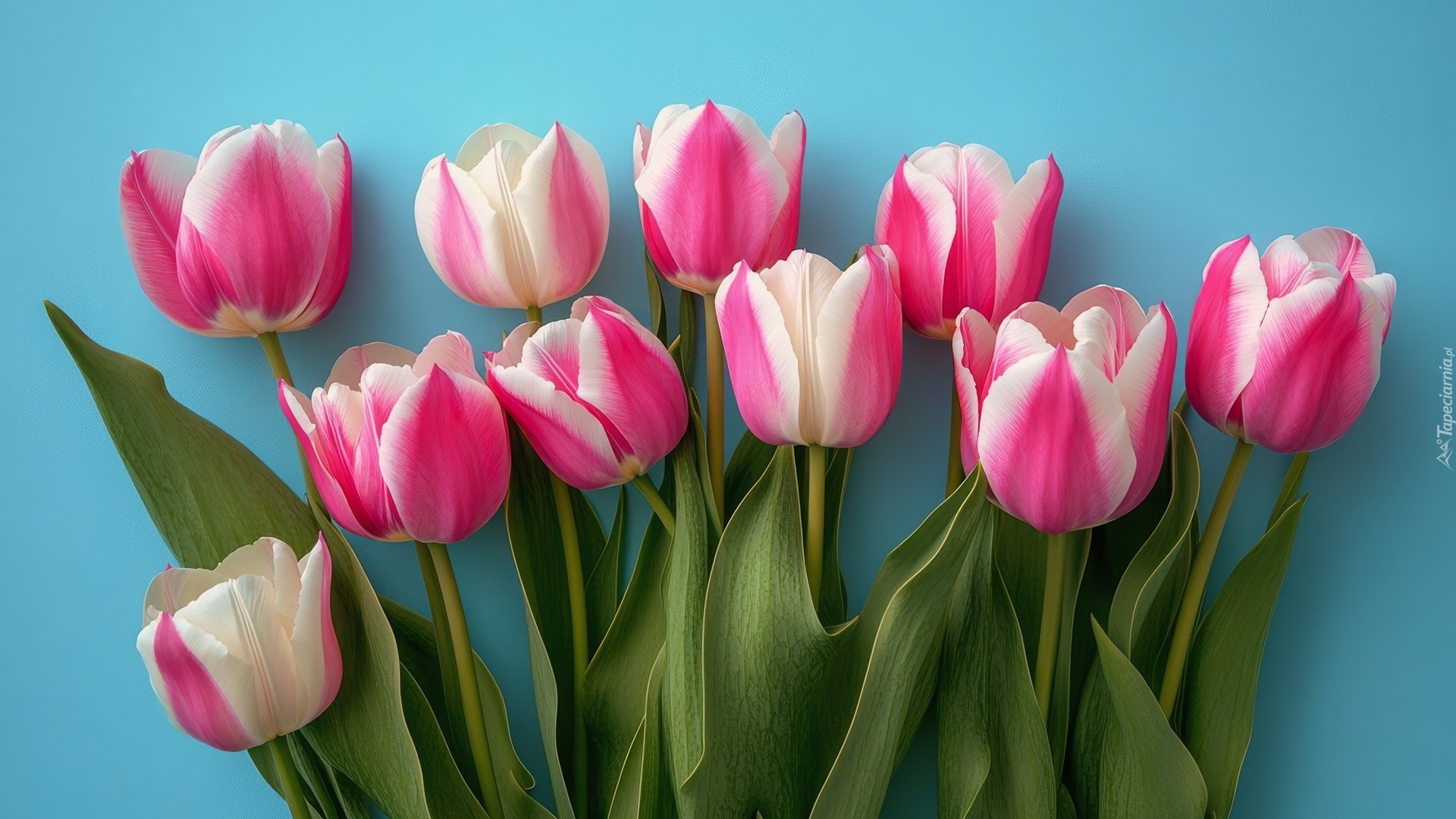 Edytor tapety: Różowo-białe tulipany na niebieskim tle