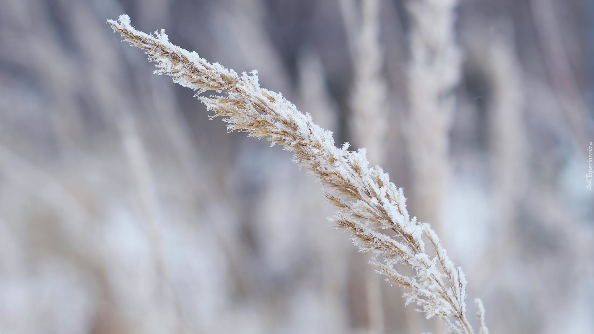 Edytor tapety: Oszronione źdźbło trawy na rozmytym tle