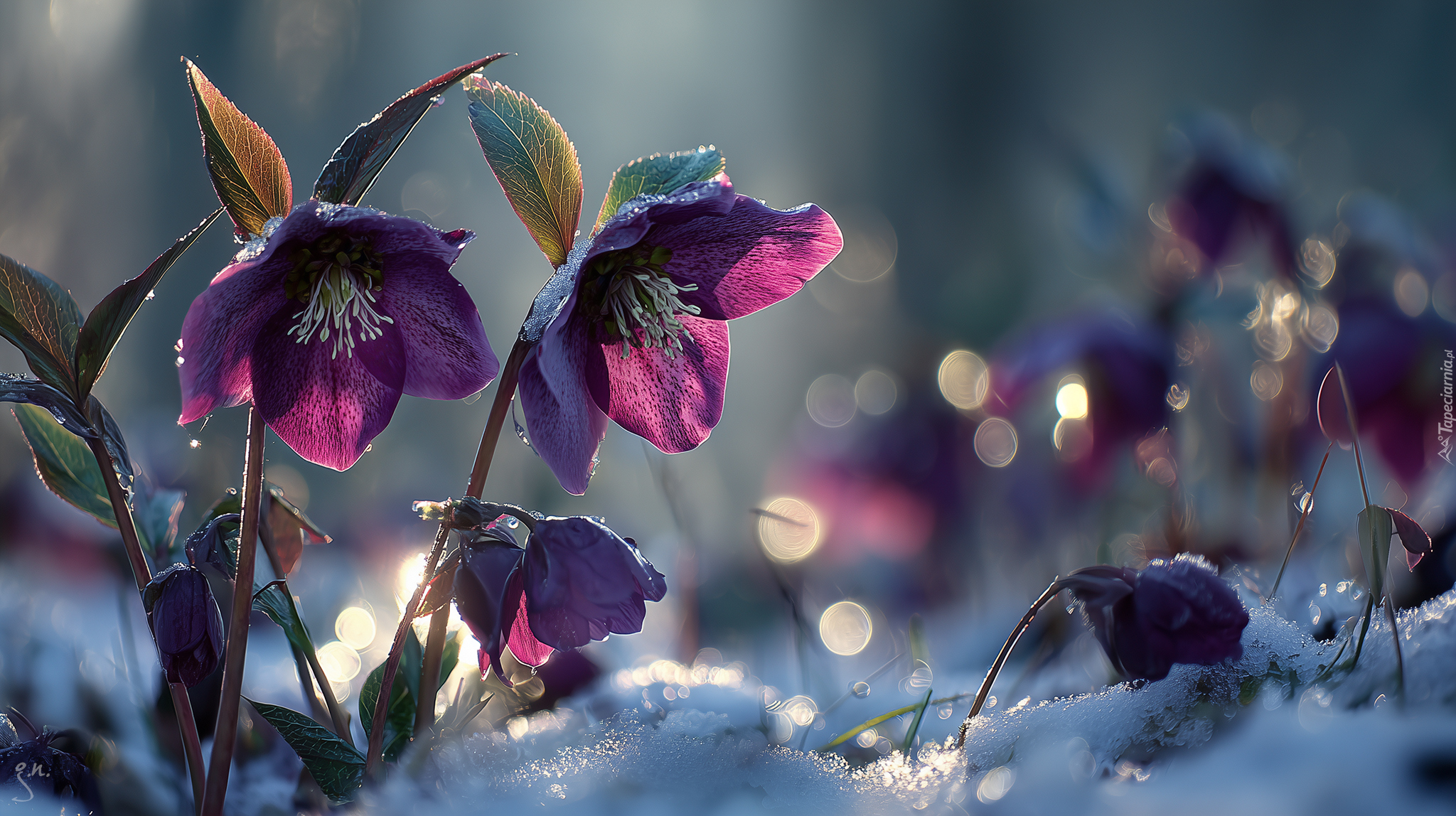 Edytor tapety: Rozświetlone bordowe ciemierniki w śniegu
