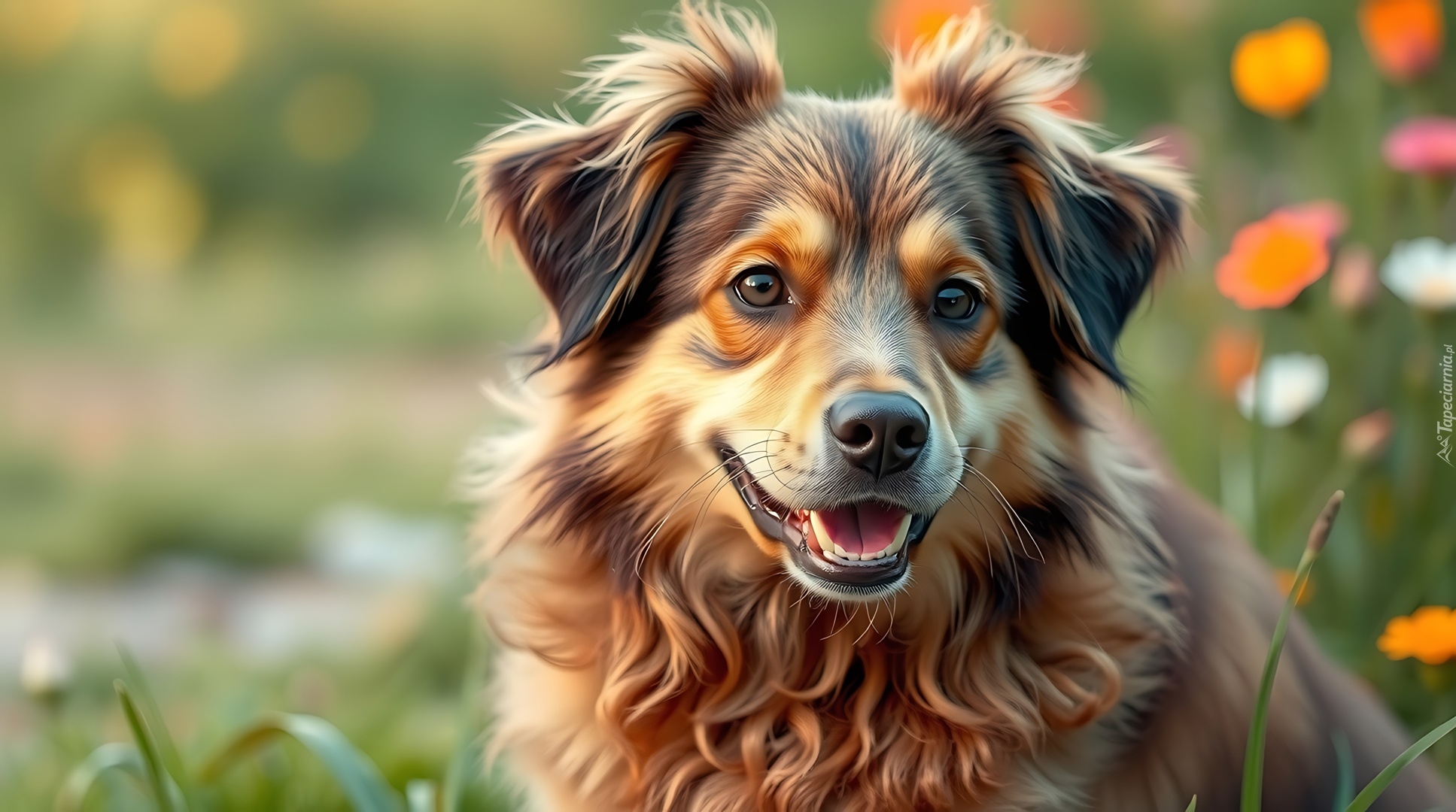 Edytor tapety: Rudo-brązowy pies wśród kwiatów na łące