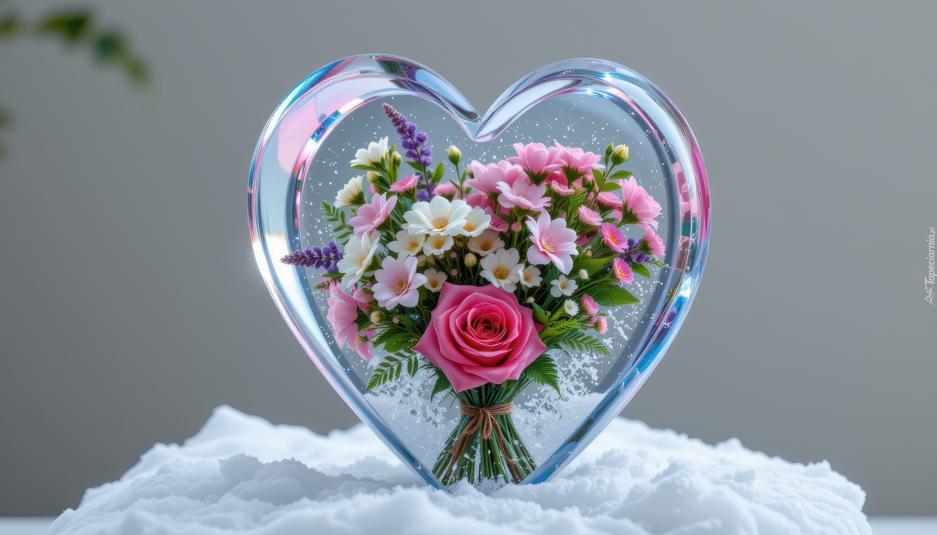 Edytor tapety: Bukiet kwiatów w szklanym sercu na śniegu