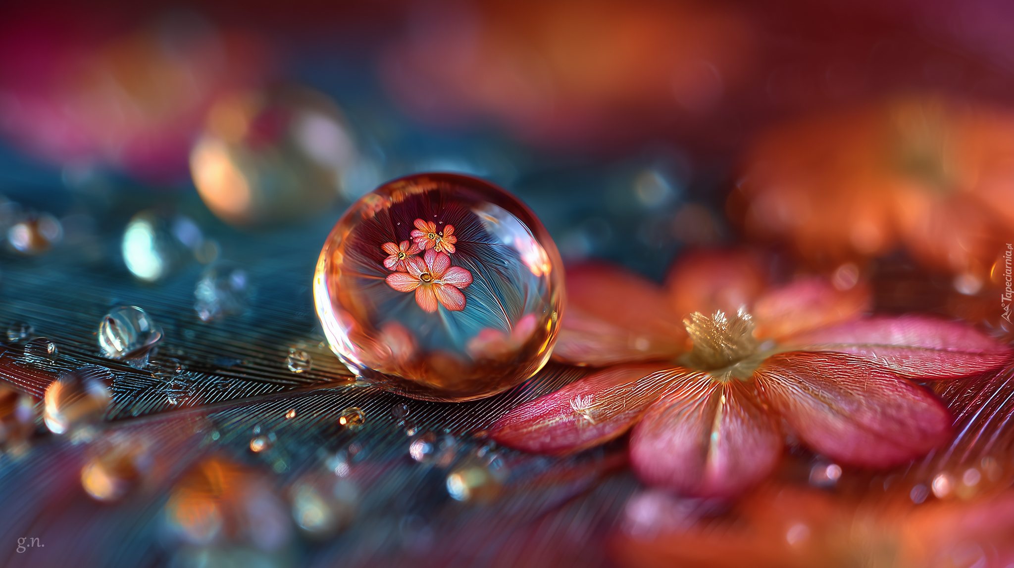 Edytor tapety: Kropla wody i kwiat na piórku w grafice