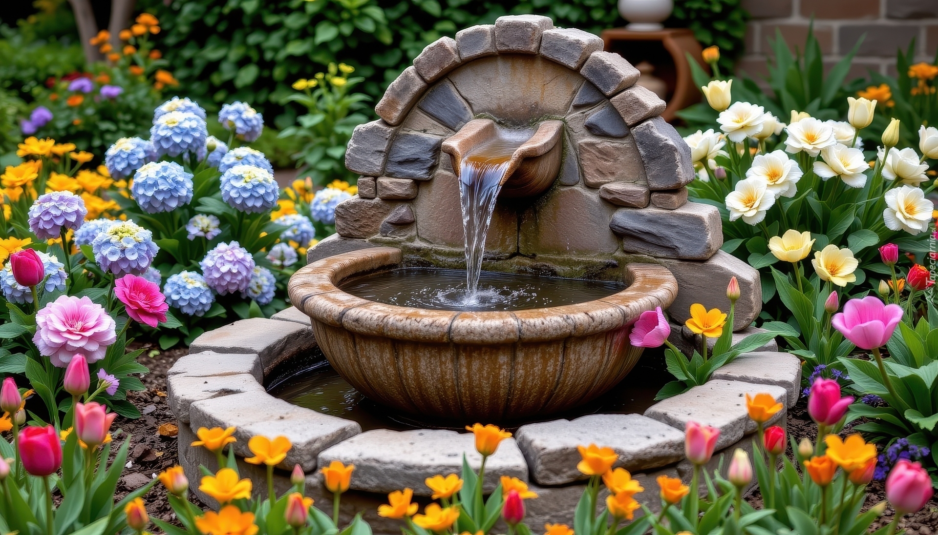 Edytor tapety: Mała fontanna i kwiaty przy kamieniach w ogrodzie