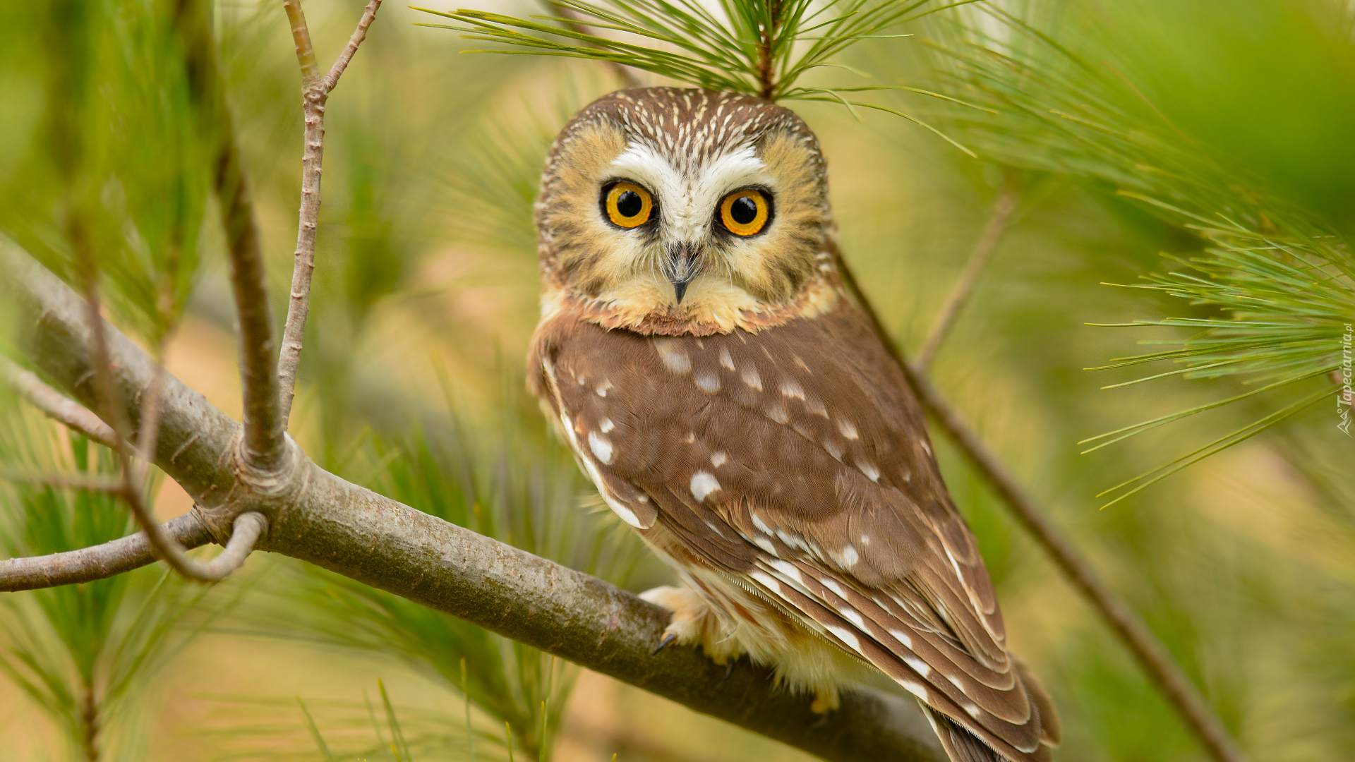 Edytor tapety: Włochatka mała na gałązce sosny