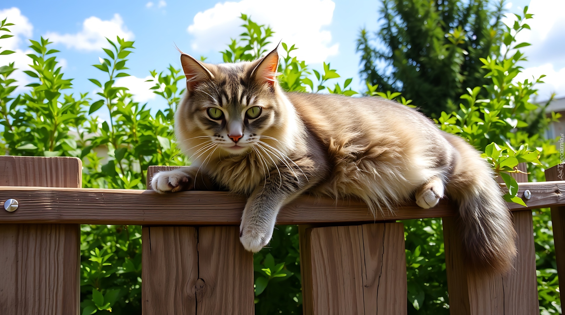 Edytor tapety: Puszysty kot leżący na drewnianym płocie