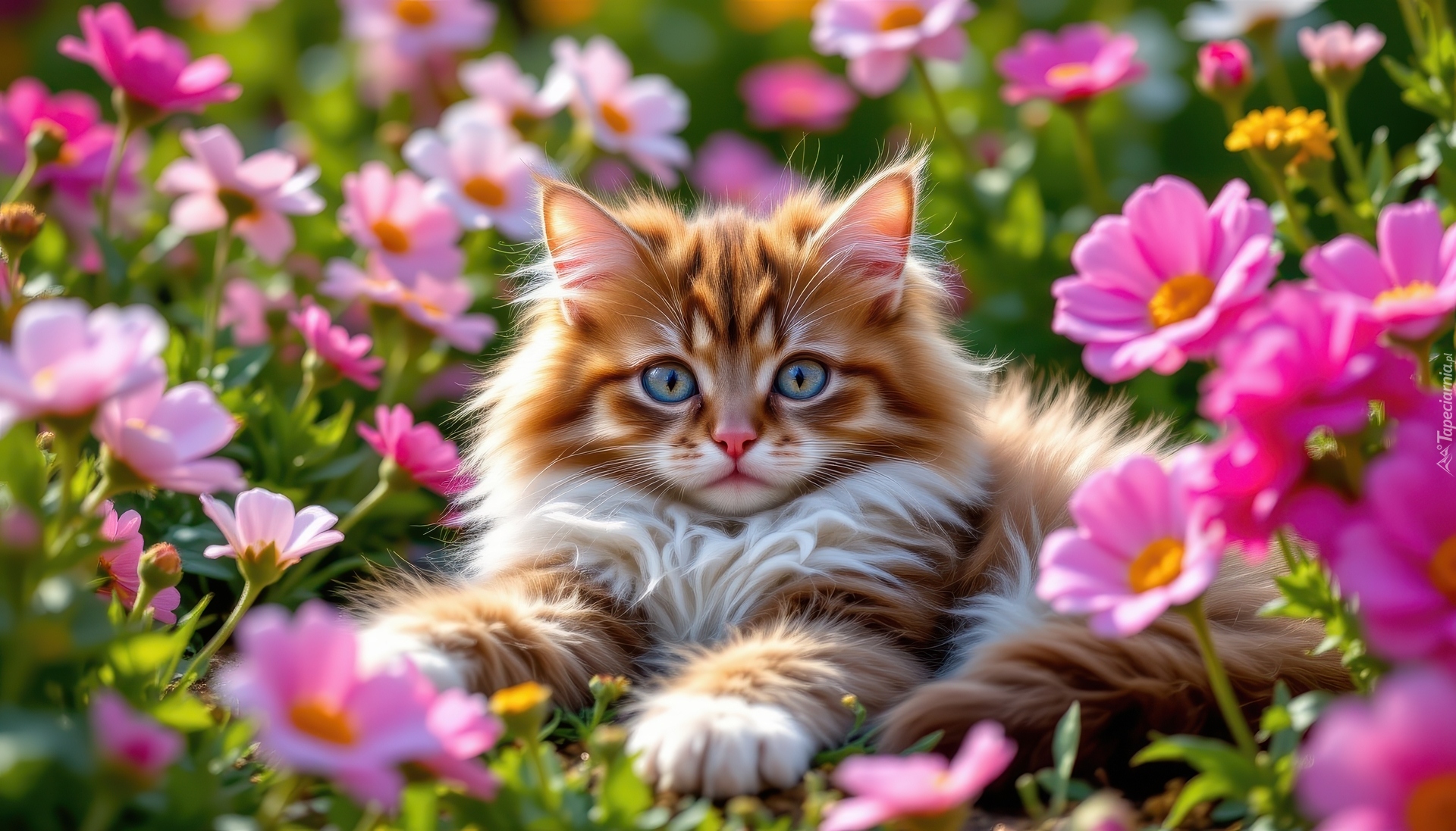 Edytor tapety: Spojrzenie puszystego kota leżącego wśród różowych kwiatów