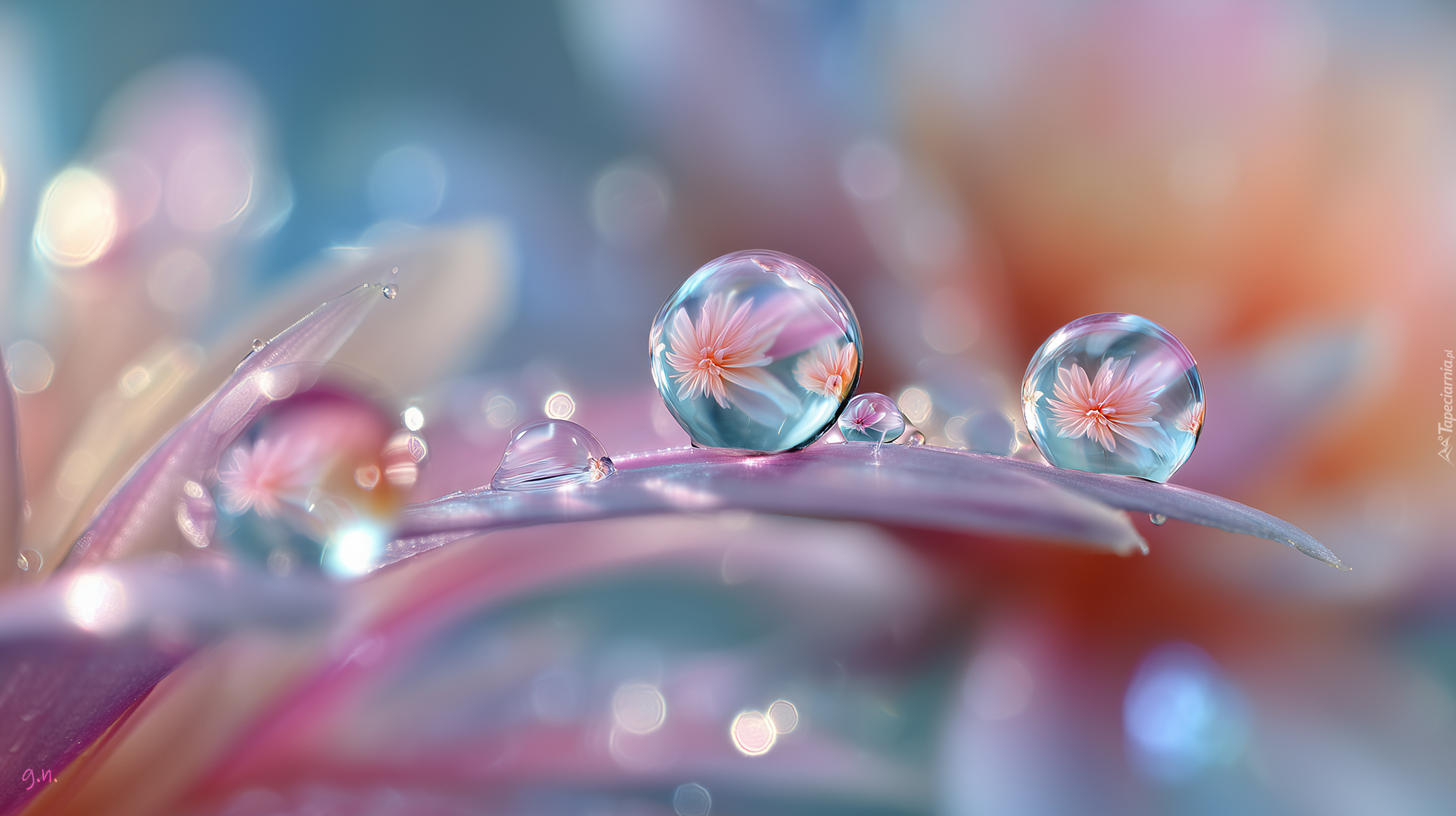 Edytor tapety: Krople wody na płatkach kwiatów w makro