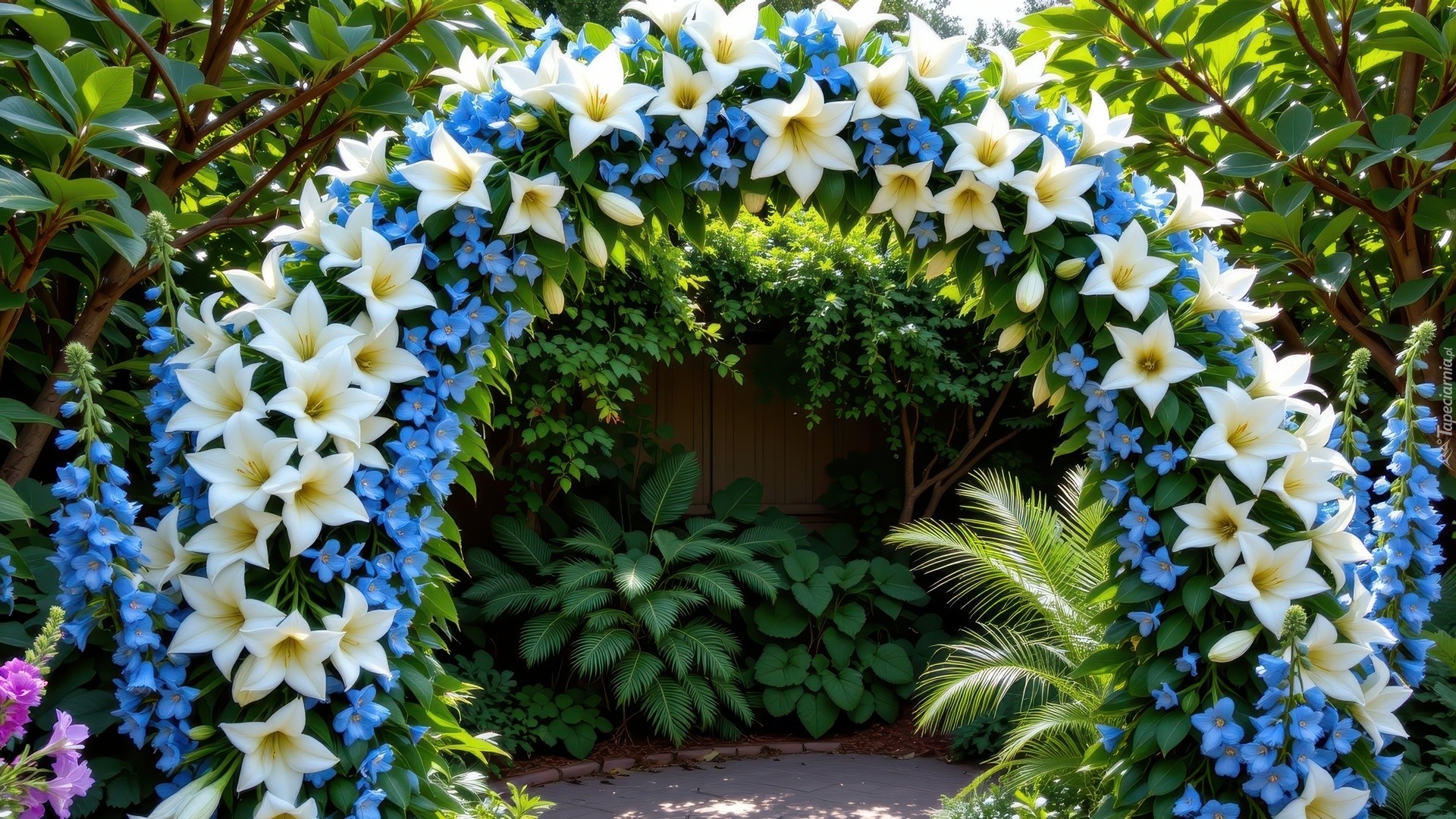 Edytor tapety: Łuk ogrodowy z białych i niebieskich kwiatów