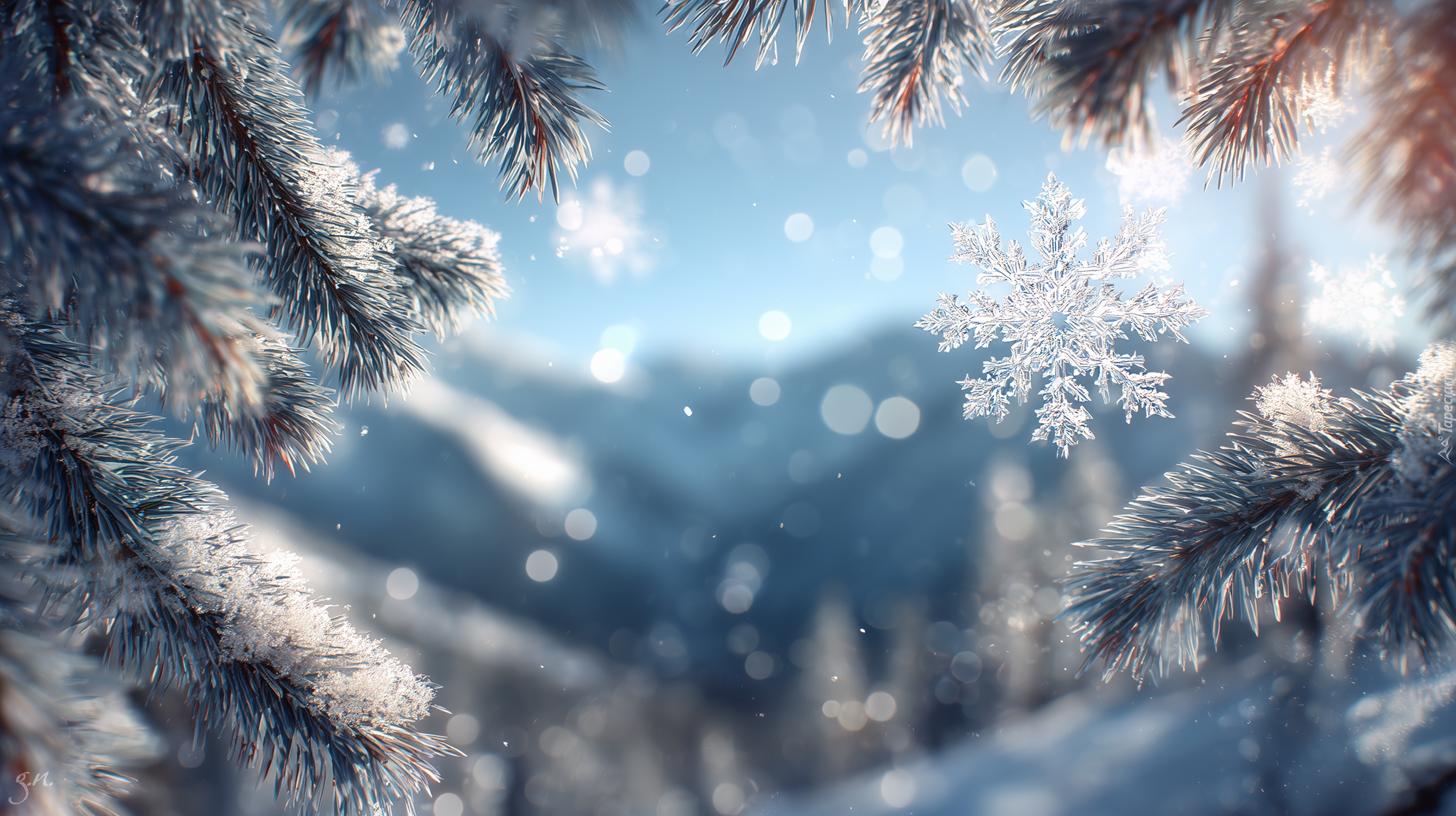 Edytor tapety: Śnieżynka i ośnieżone gałązki sosny rozświetlone słonecznym światłem