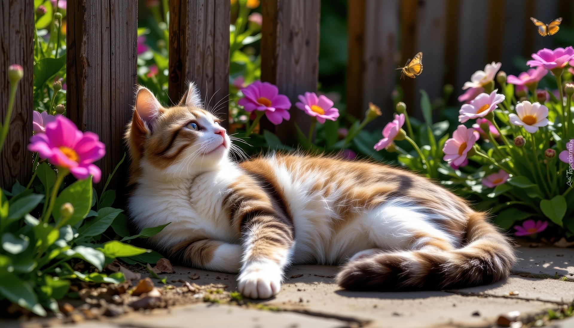 Edytor tapety: Rudo-biały kot leżący obok kwiatów pod płotem