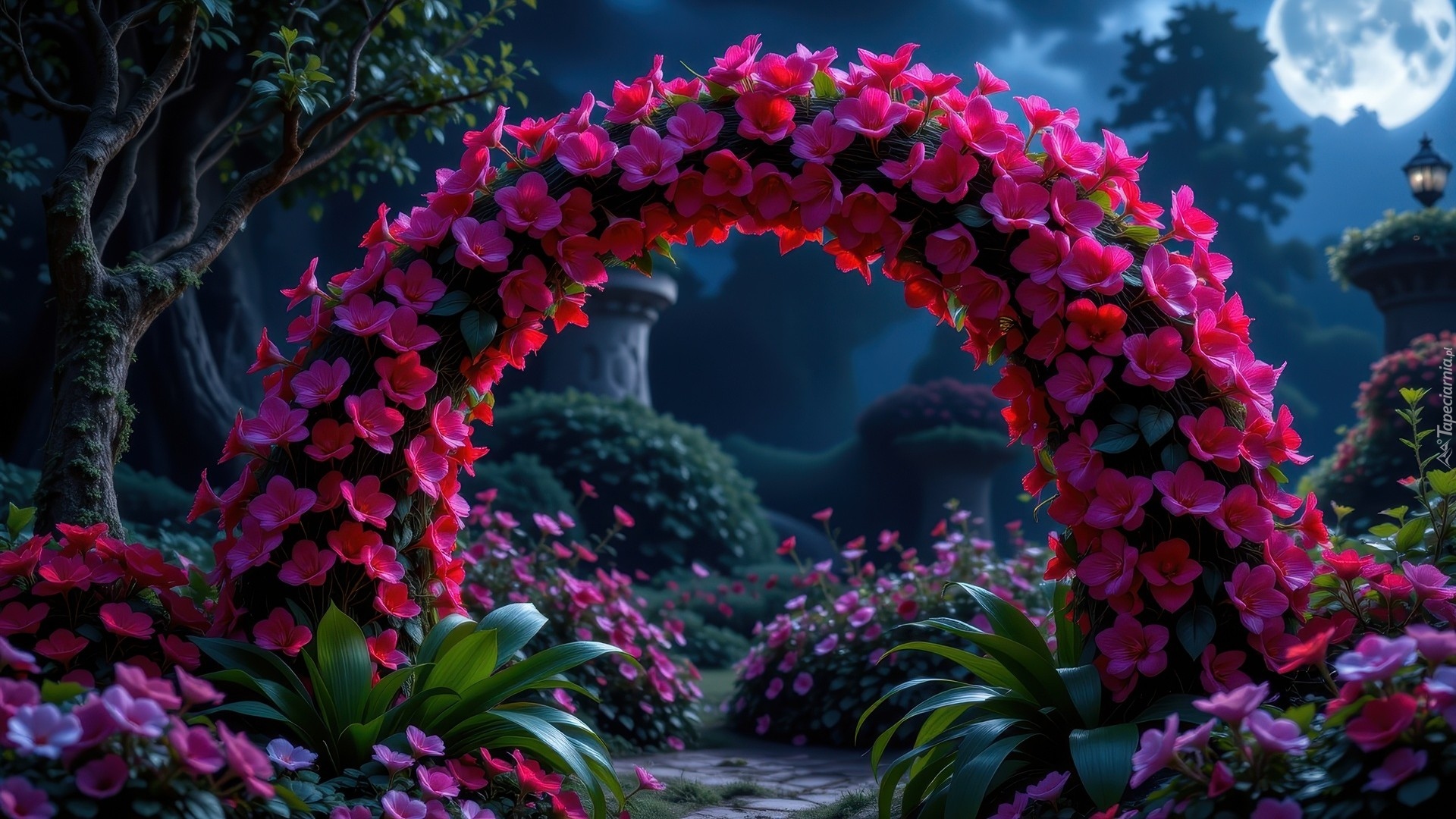 Edytor tapety: Łuk ogrodowy z czerwonych kwiatów w blasku księżyca