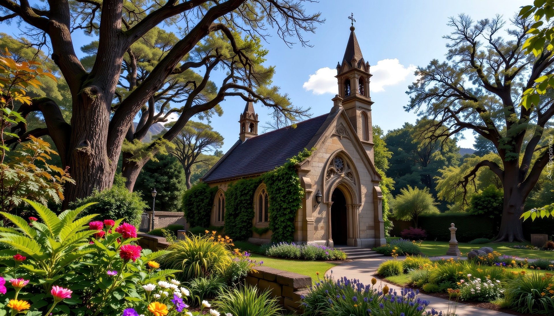 Edytor tapety: Kościół opleciony bluszczem wśród drzew i kwiatów