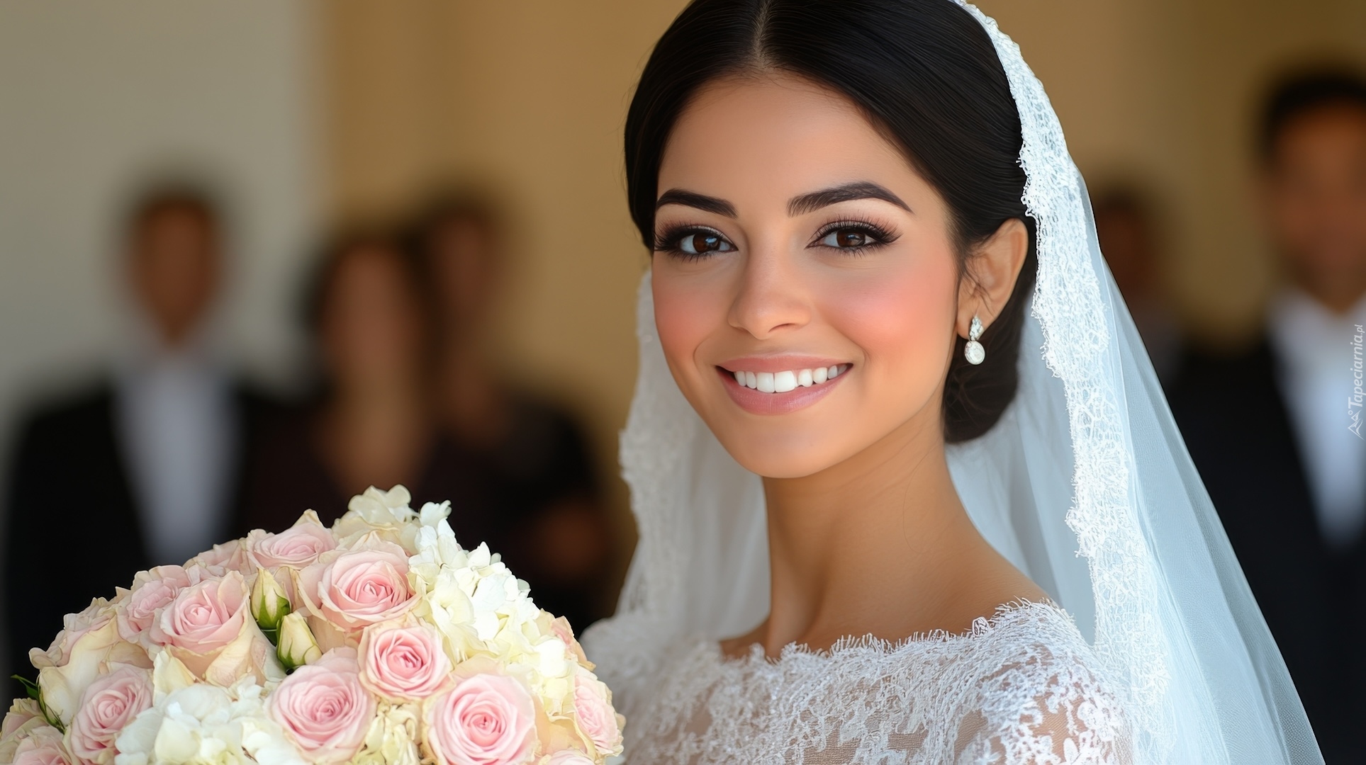 Edytor tapety: Uśmiechnięta panna młoda z bukietem biało-różowych róż