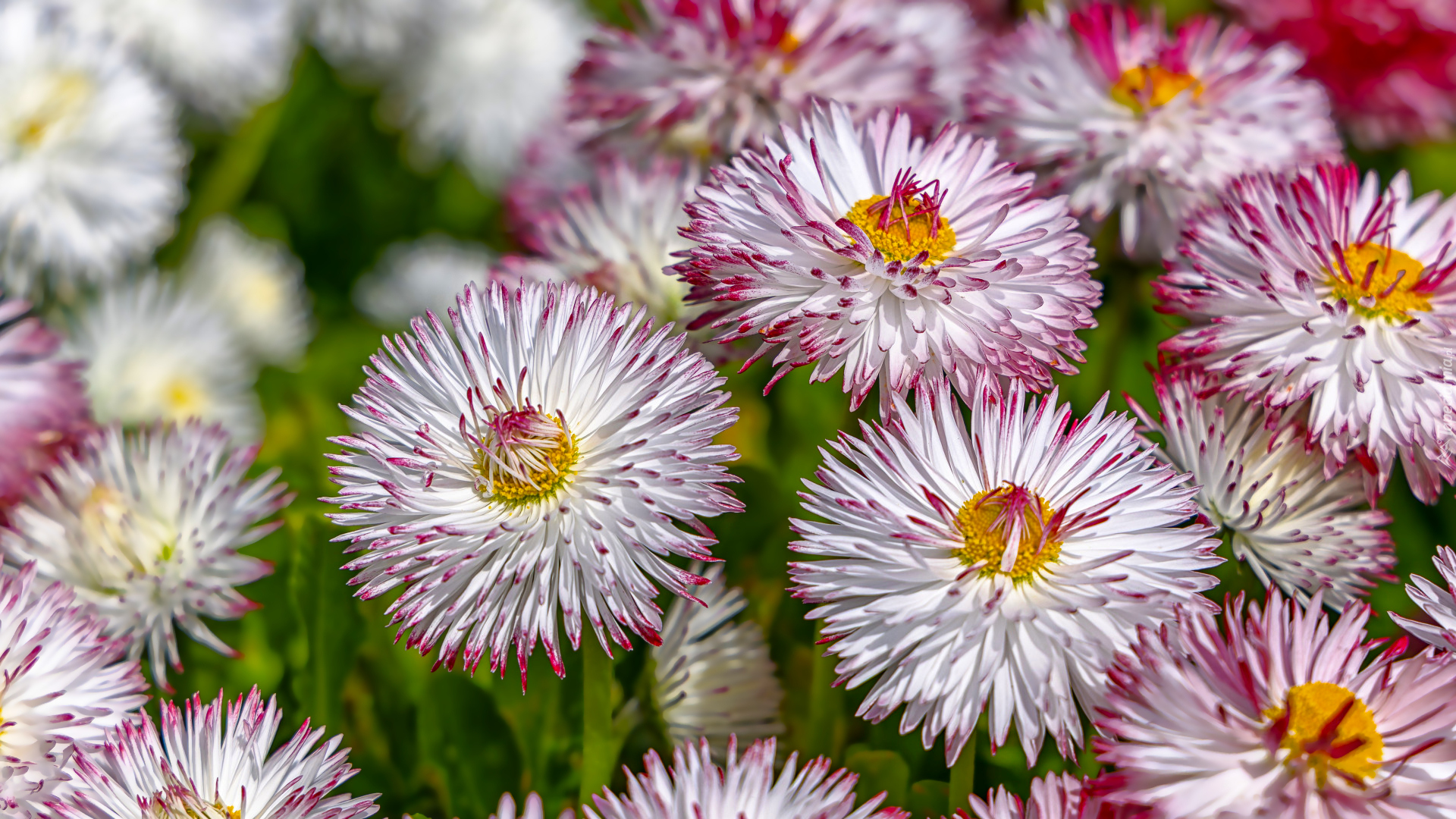 Edytor tapety: Biało-różowe stokrotki w zbliżeniu