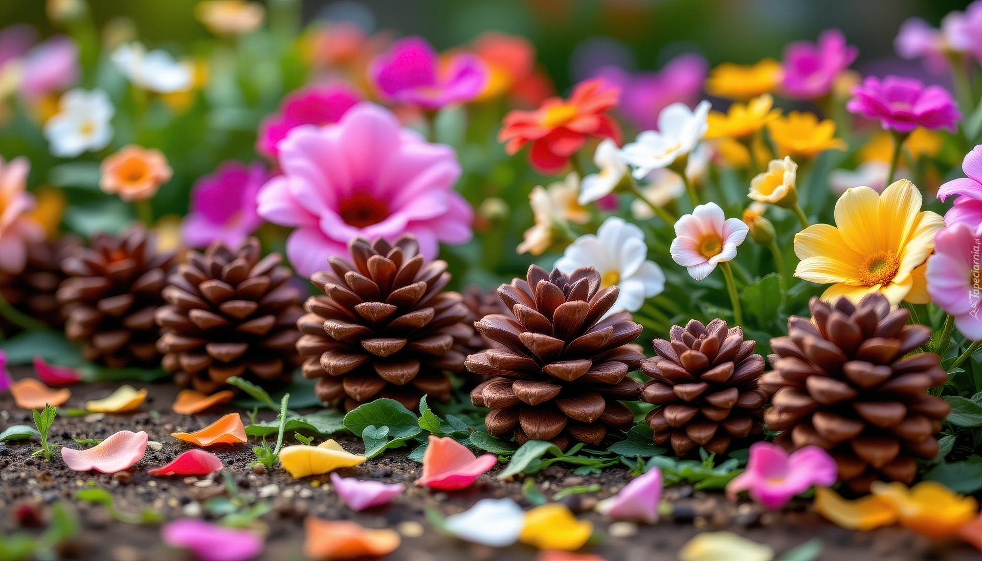 Edytor tapety: Szyszki wśród kolorowych kwiatów