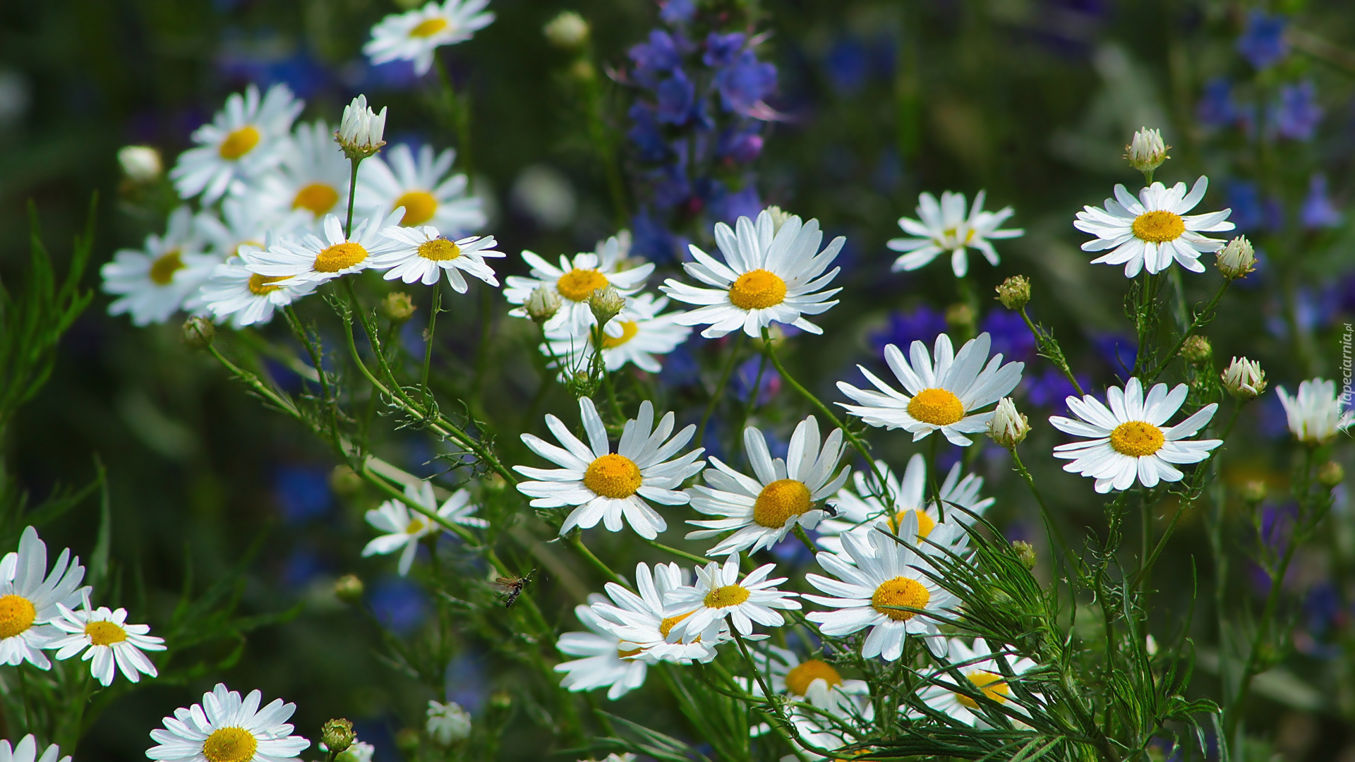 Edytor tapety: Białe rumianki pospolite na łące w zbliżeniu