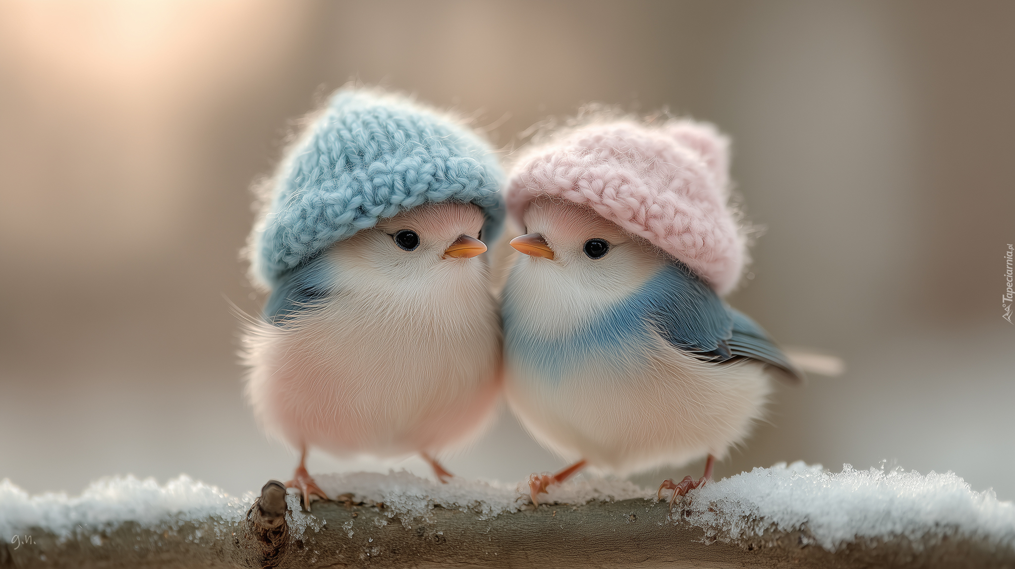 Edytor tapety: Dwa ptaszki w ciepłych czapkach na gałęzi