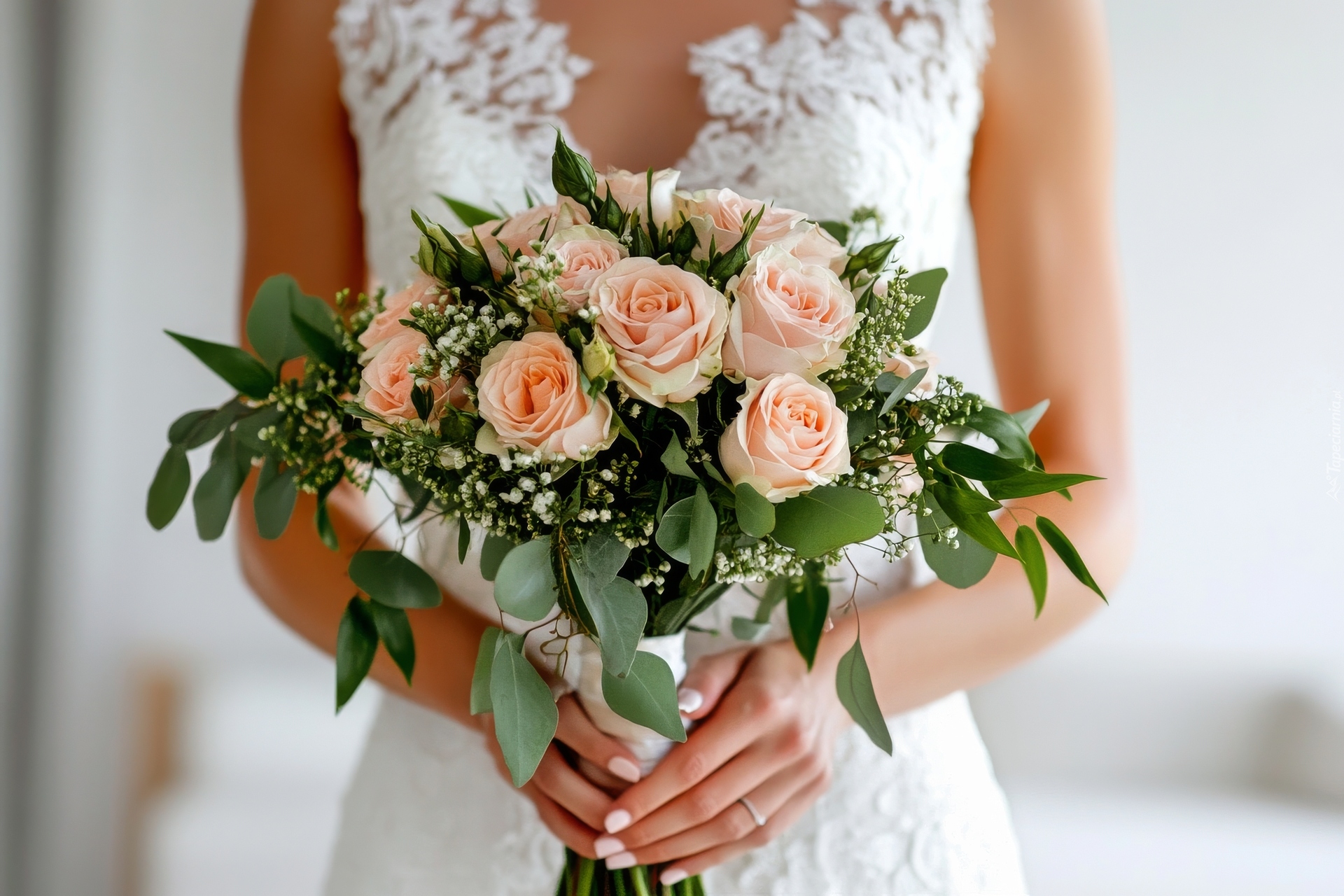 Edytor tapety: Bukiet róż z liśćmi w rękach kobiety