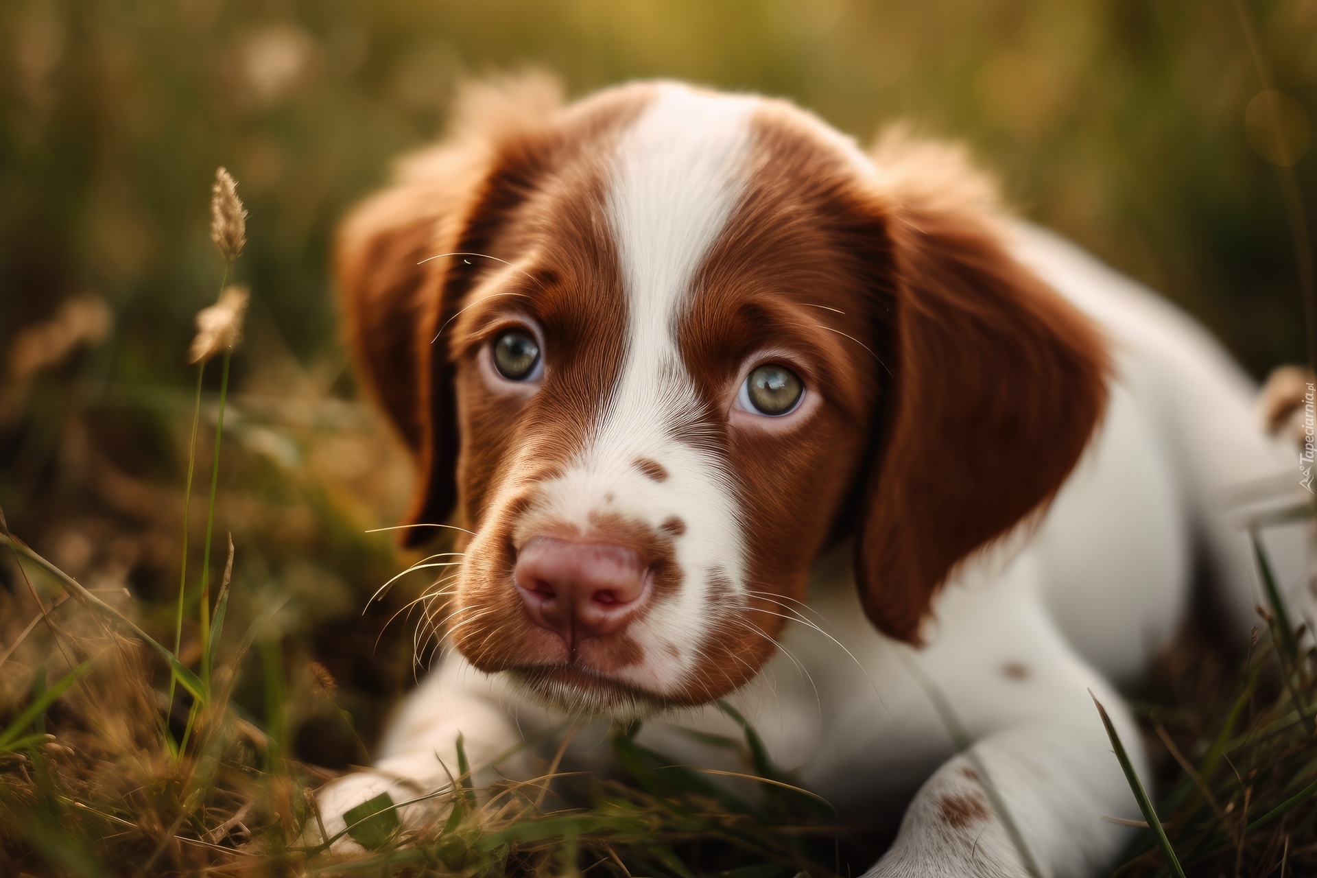 Edytor tapety: Biało-brązowy pies leżący na trawie