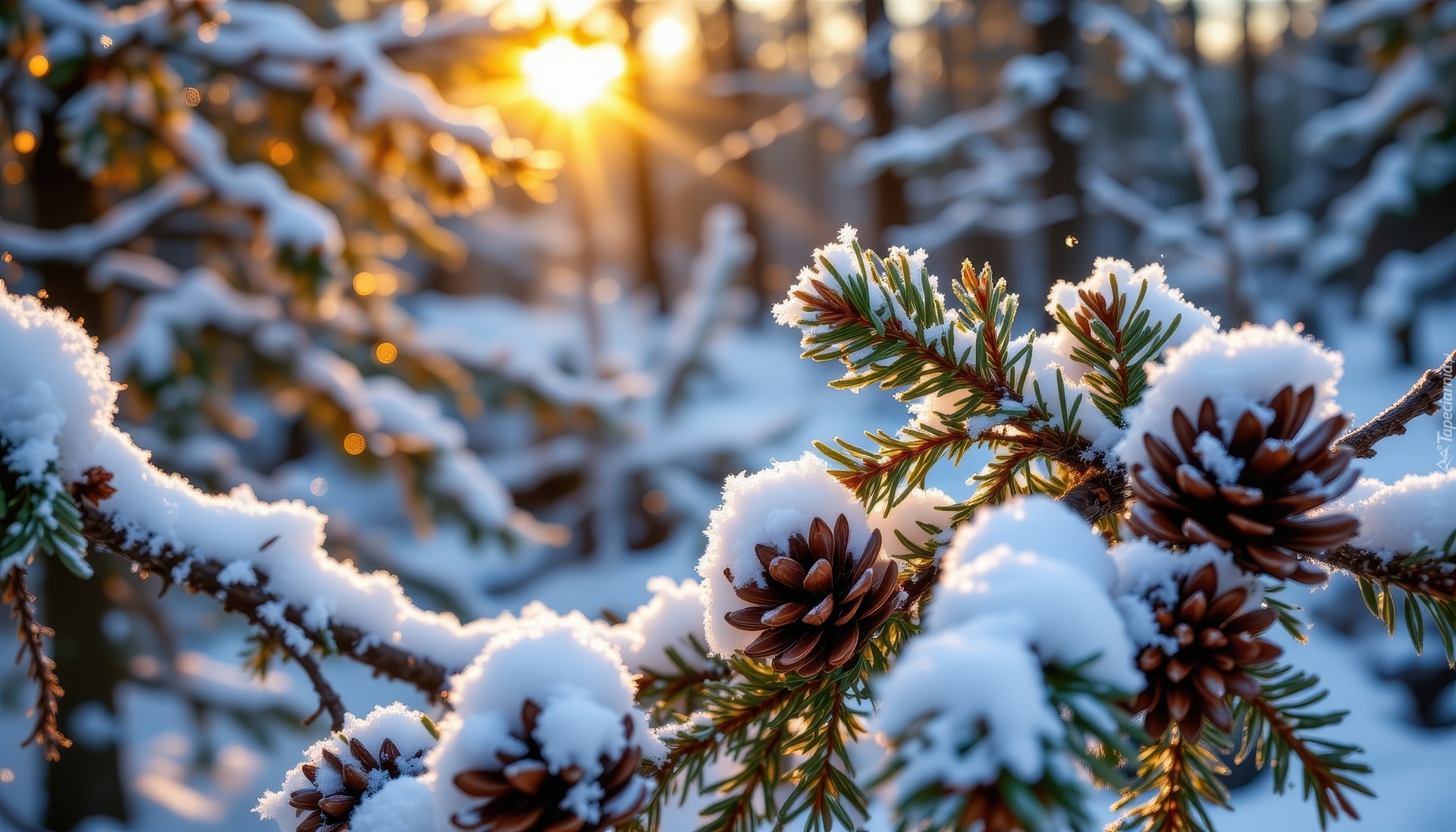 Edytor tapety: Szyszki na ośnieżonych gałęziach w blasku zachodzącego słońca