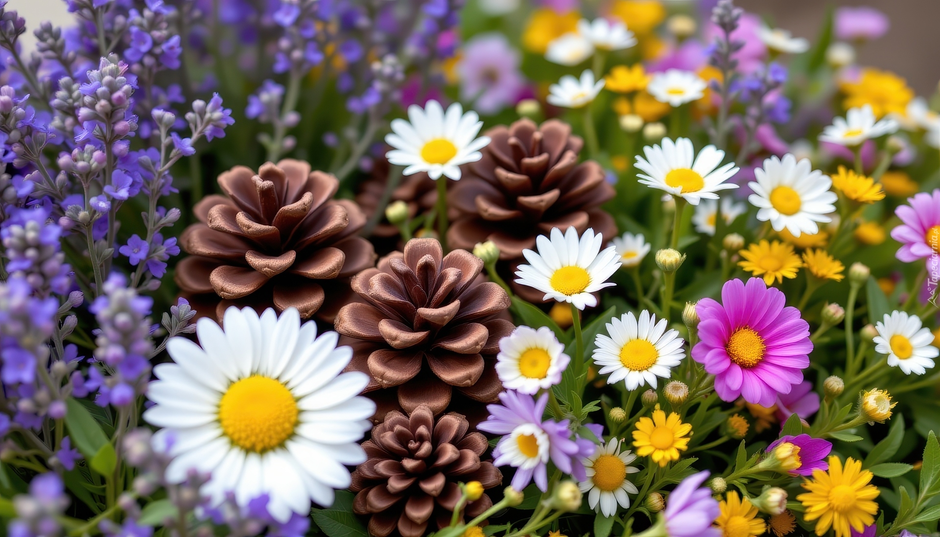Edytor tapety: Szyszki wśród lawendy i stokrotek