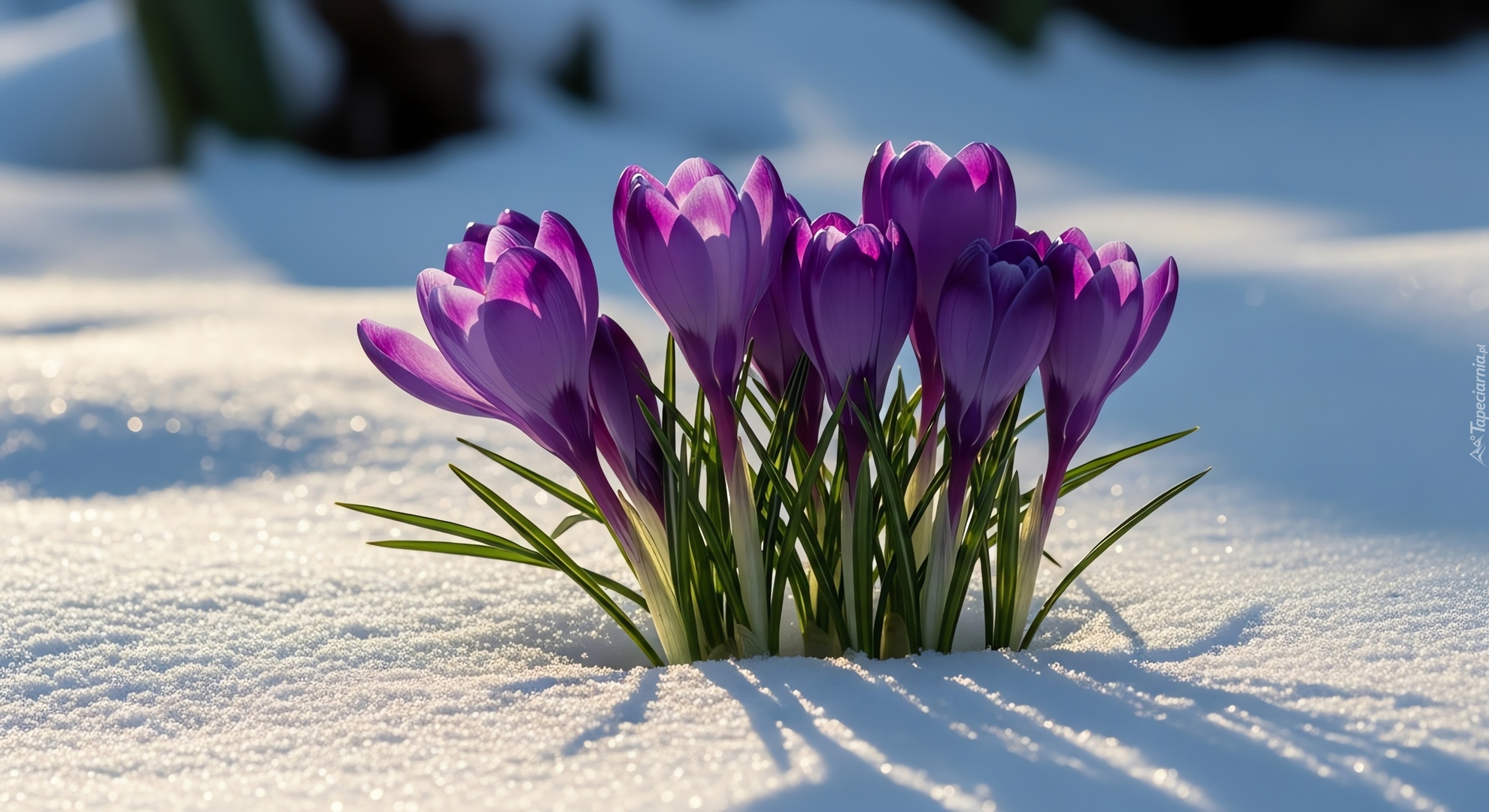 Edytor tapety: Rozświetlona kępka ciemnofioletowych krokusów w śniegu