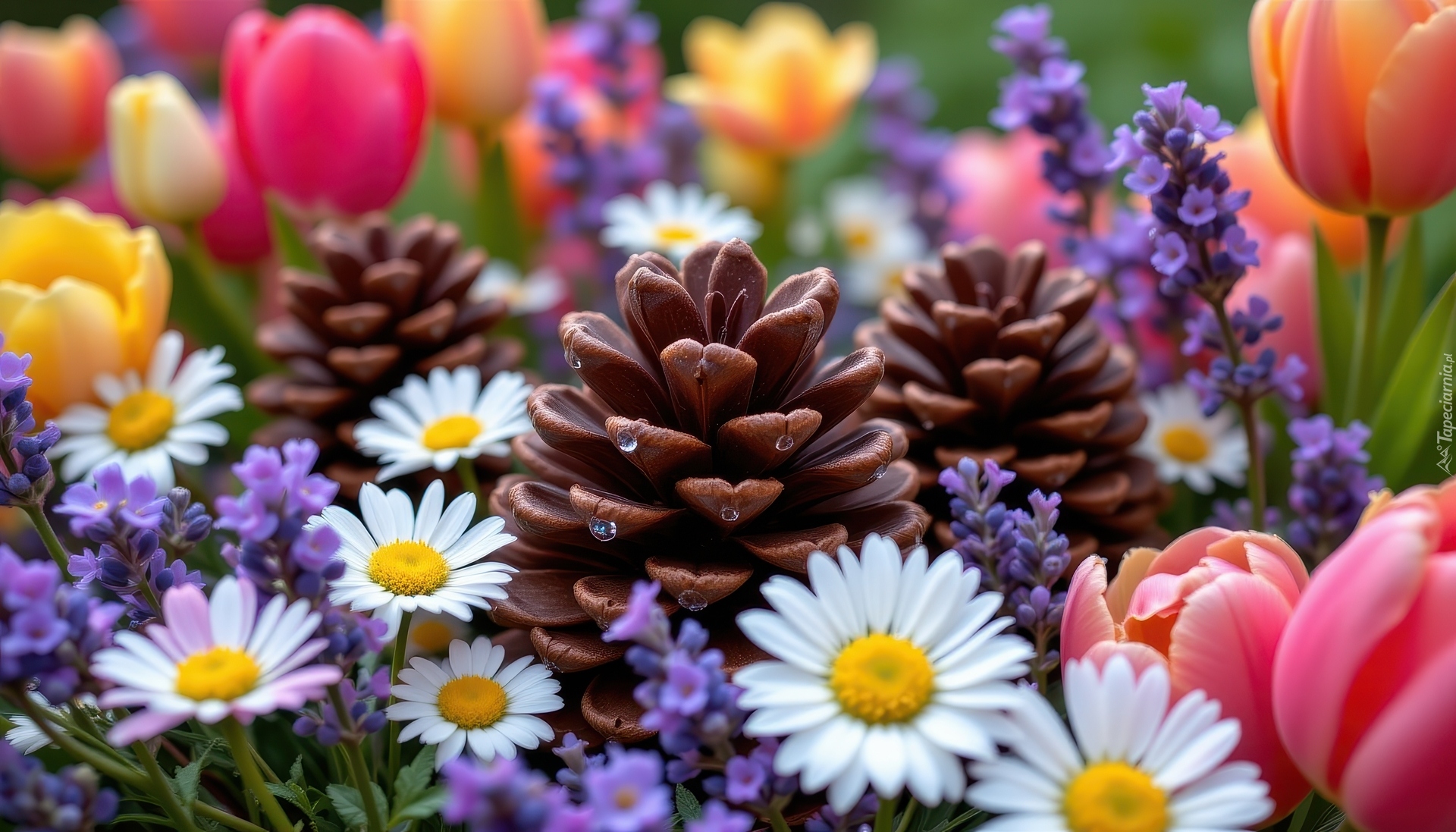 Edytor tapety: Krople na szyszkach wśród tulipanów i stokrotek