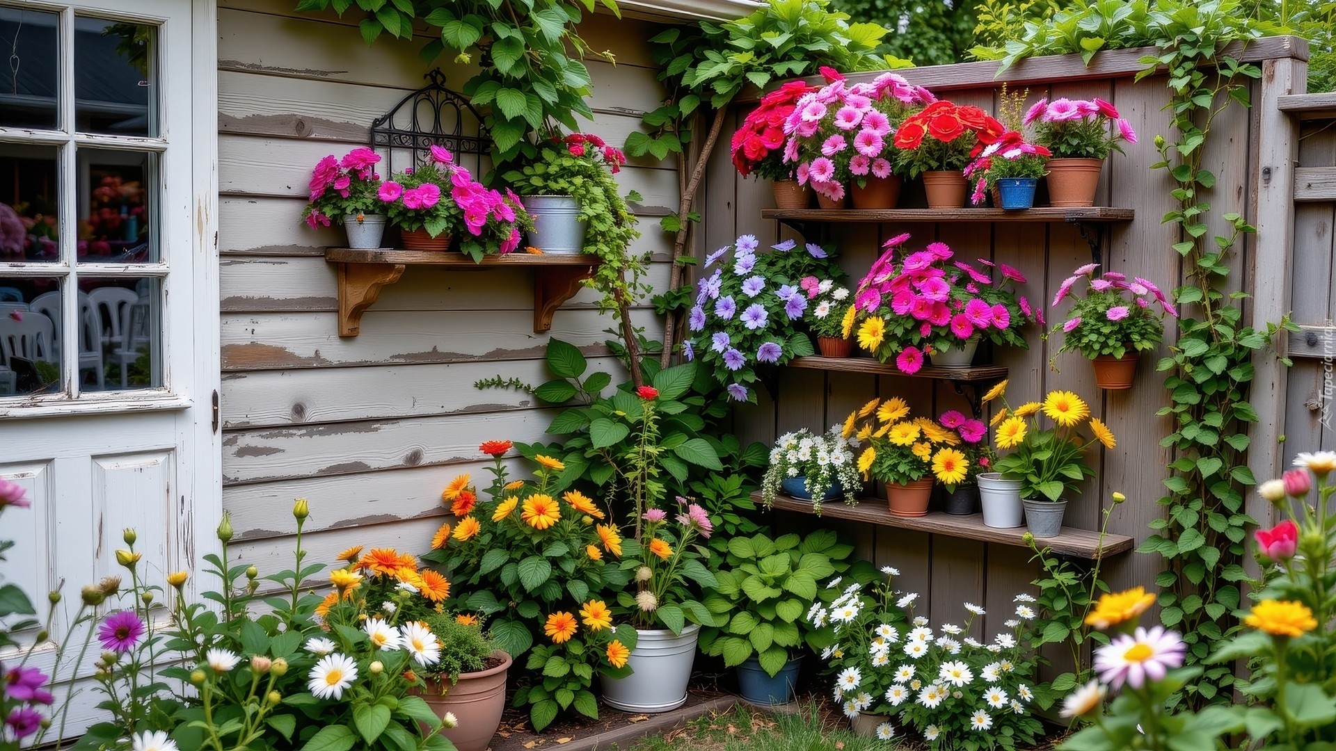 Edytor tapety: Kwiaty w doniczkach na półkach w przydomowym ogródku