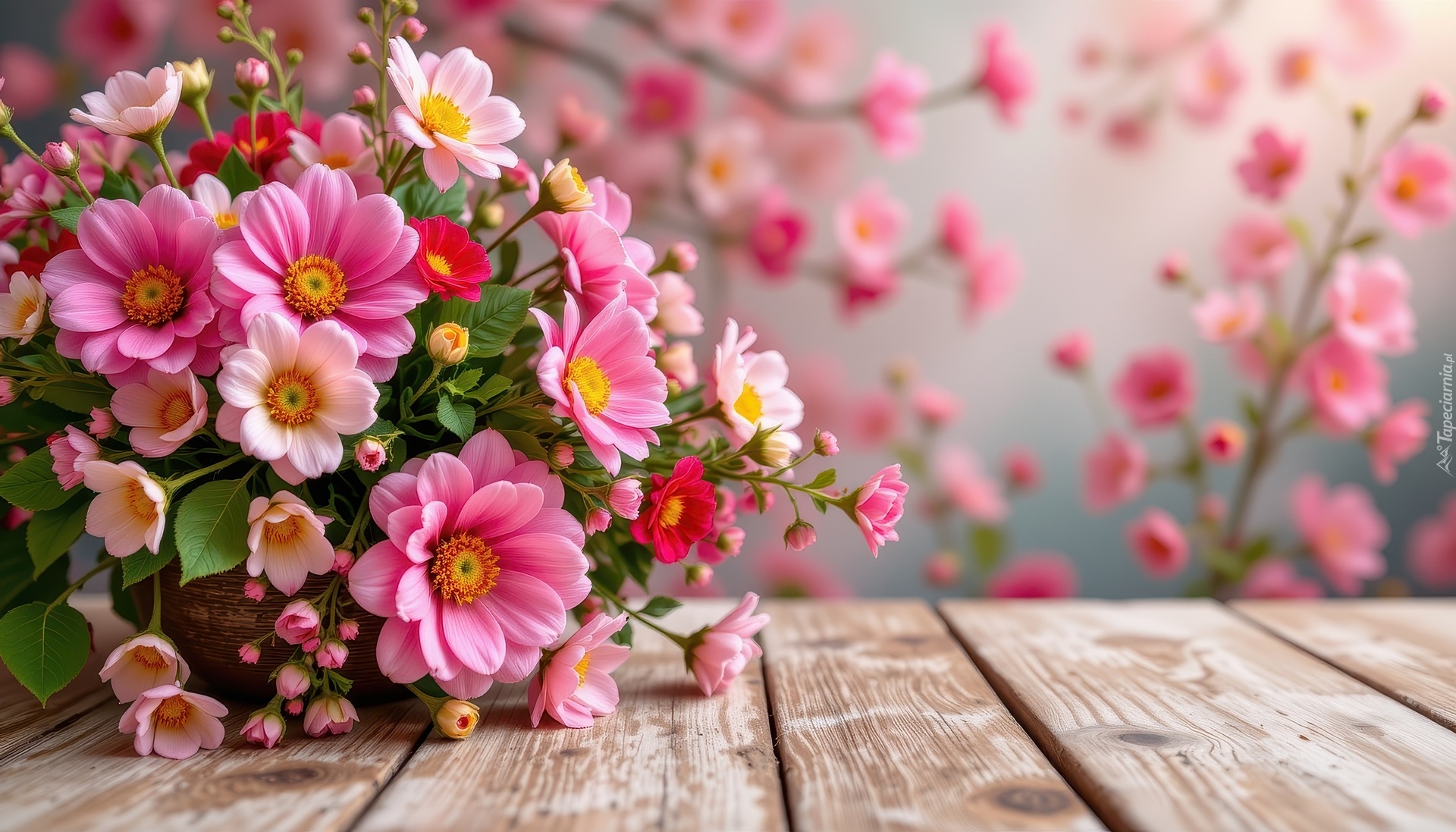 Edytor tapety: Bukiet różowych kwiatów na deskach