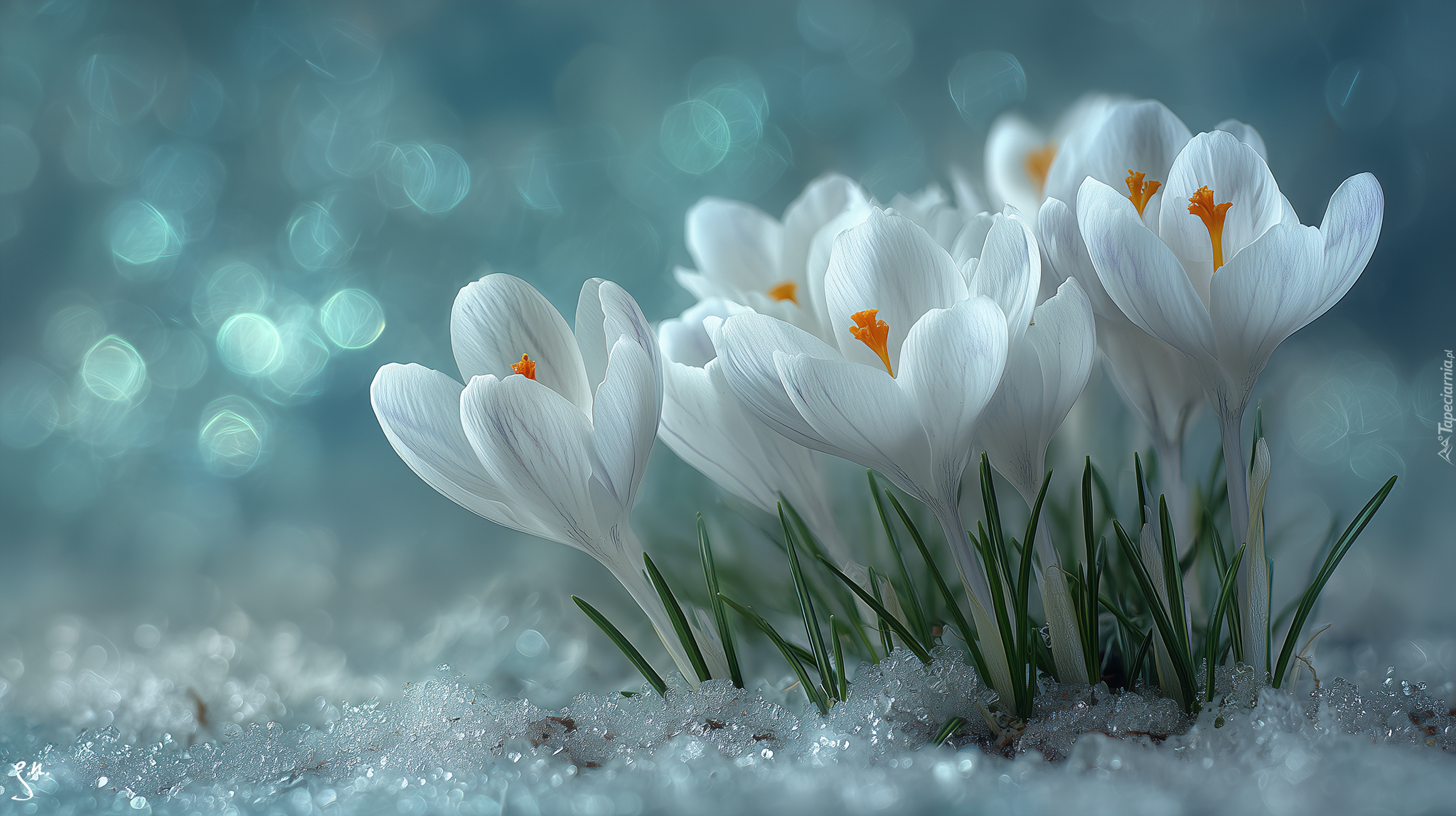 Edytor tapety: Kępka rozkwitających białych krokusów w śniegu