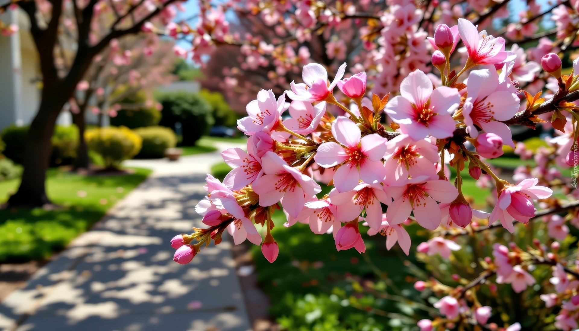 Edytor tapety: Rozświetlone światłem różowe kwiaty na gałązkach