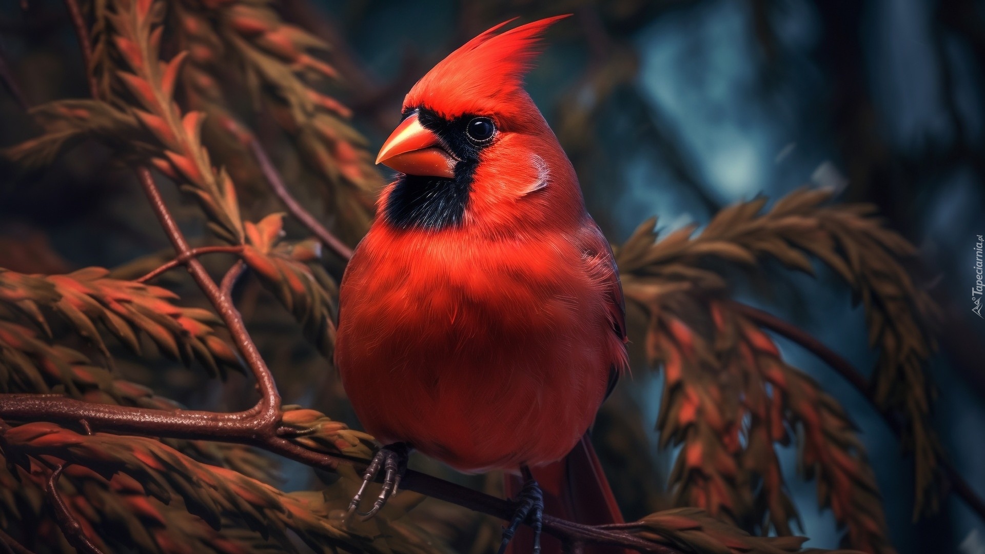 Edytor tapety: Kardynał szkarłatny na iglastych gałęziach