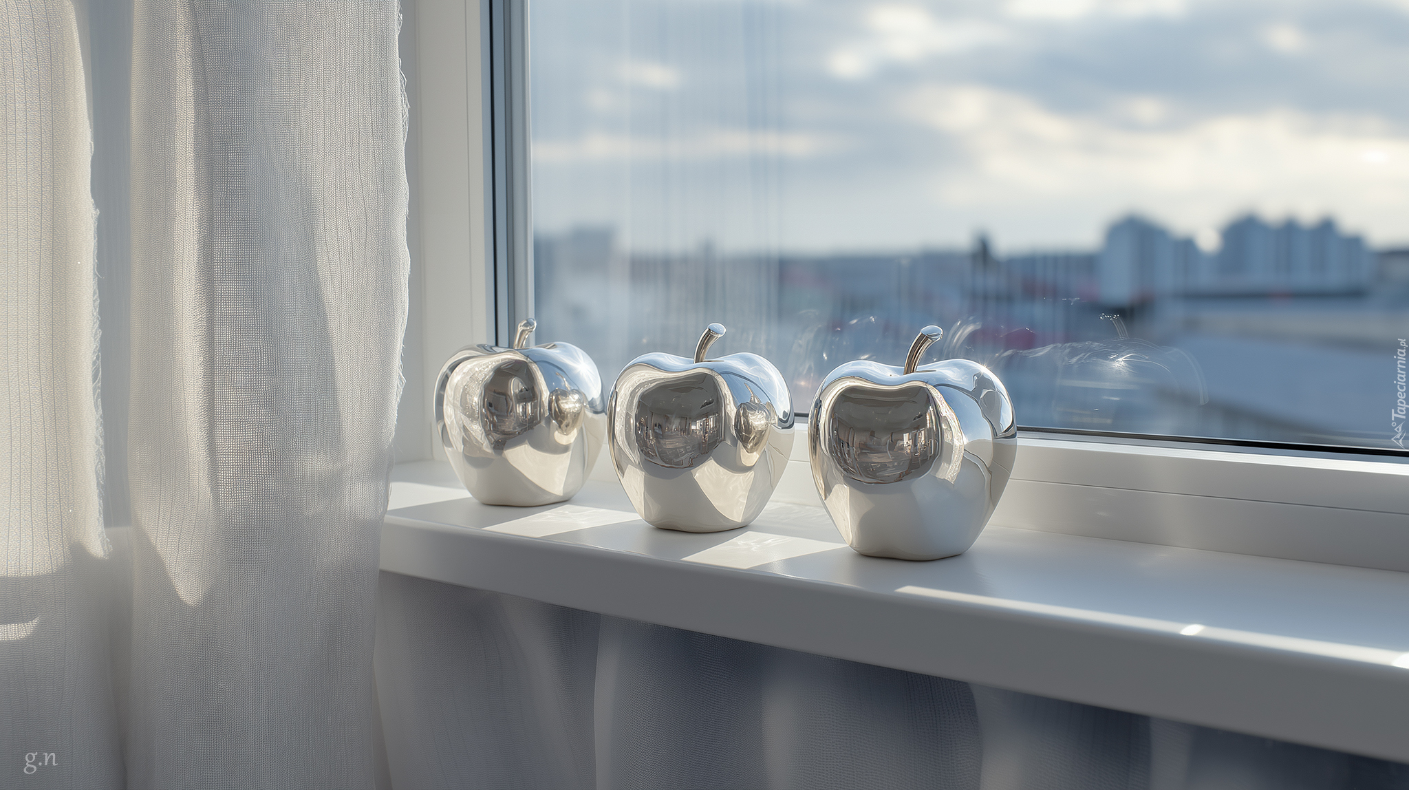 Edytor tapety: Trzy srebrne jabłka na okiennym parapecie
