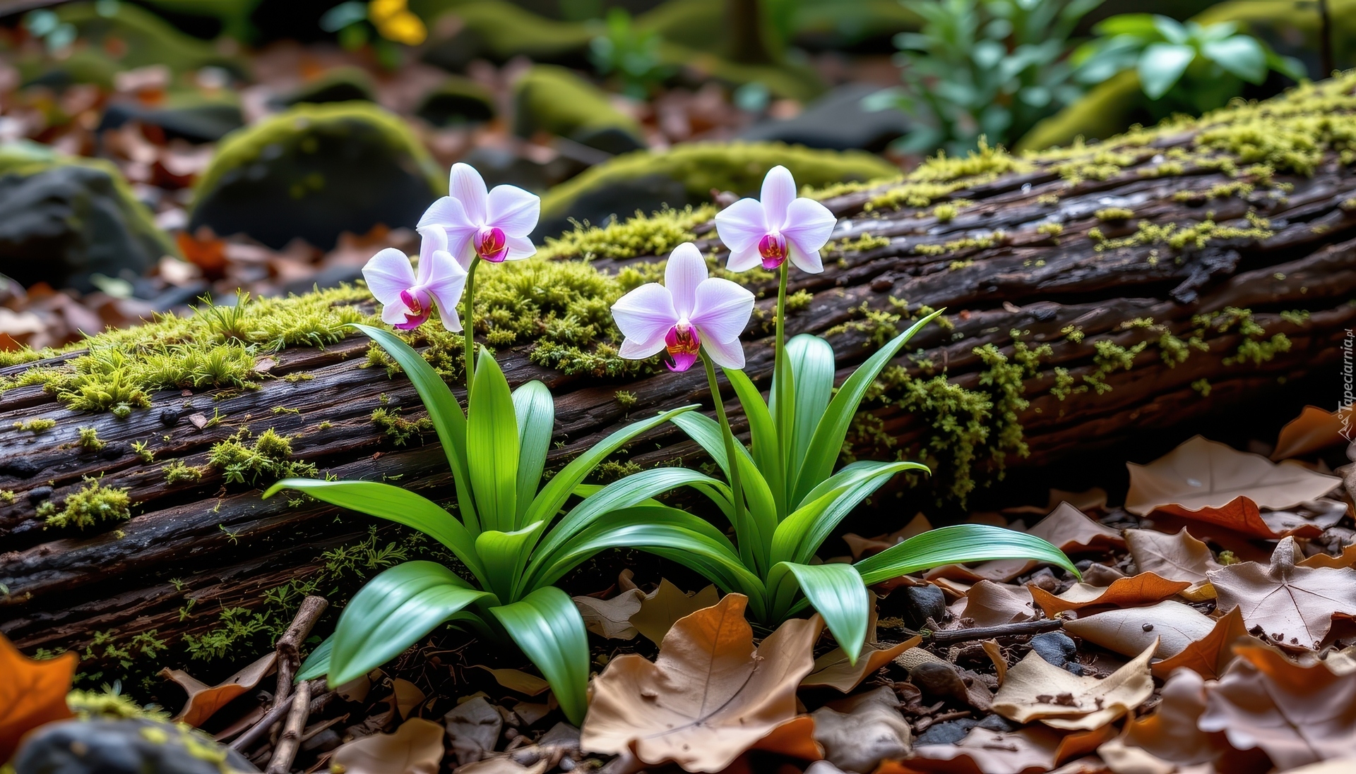 Edytor tapety: Jasnoróżowe storczyki i suche liście obok omszałej kłody