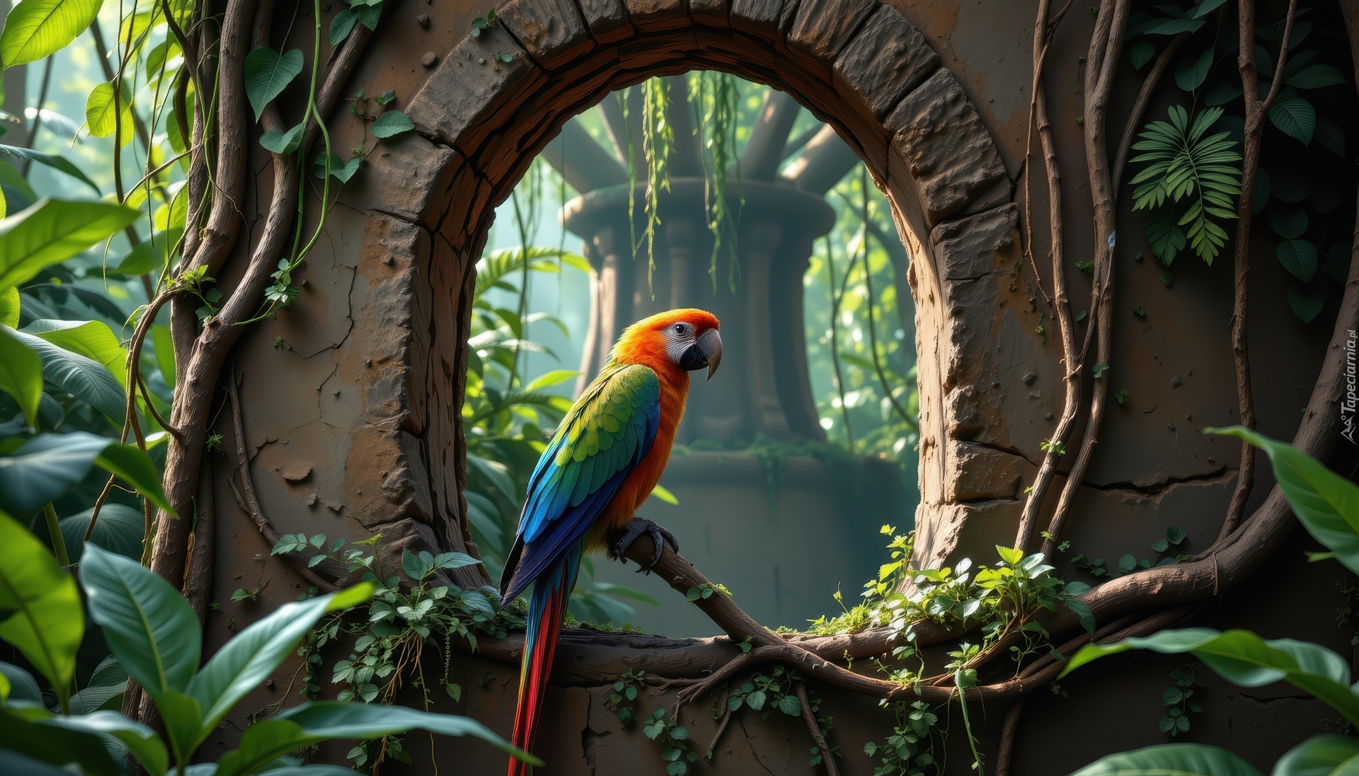 Edytor tapety: Papuga ara na gałązce przy betonowej ścianie