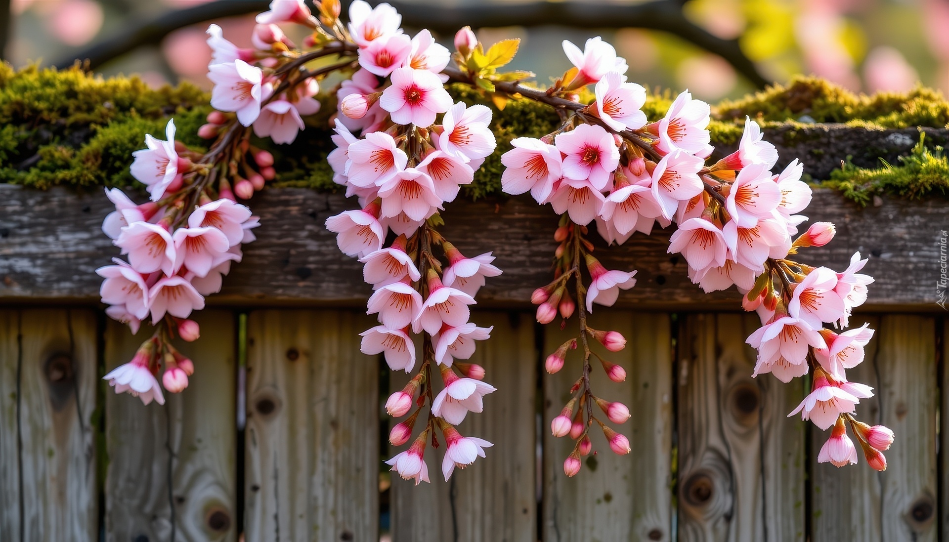 Edytor tapety: Wiszące gałązki z różowymi kwiatami na omszałym płocie