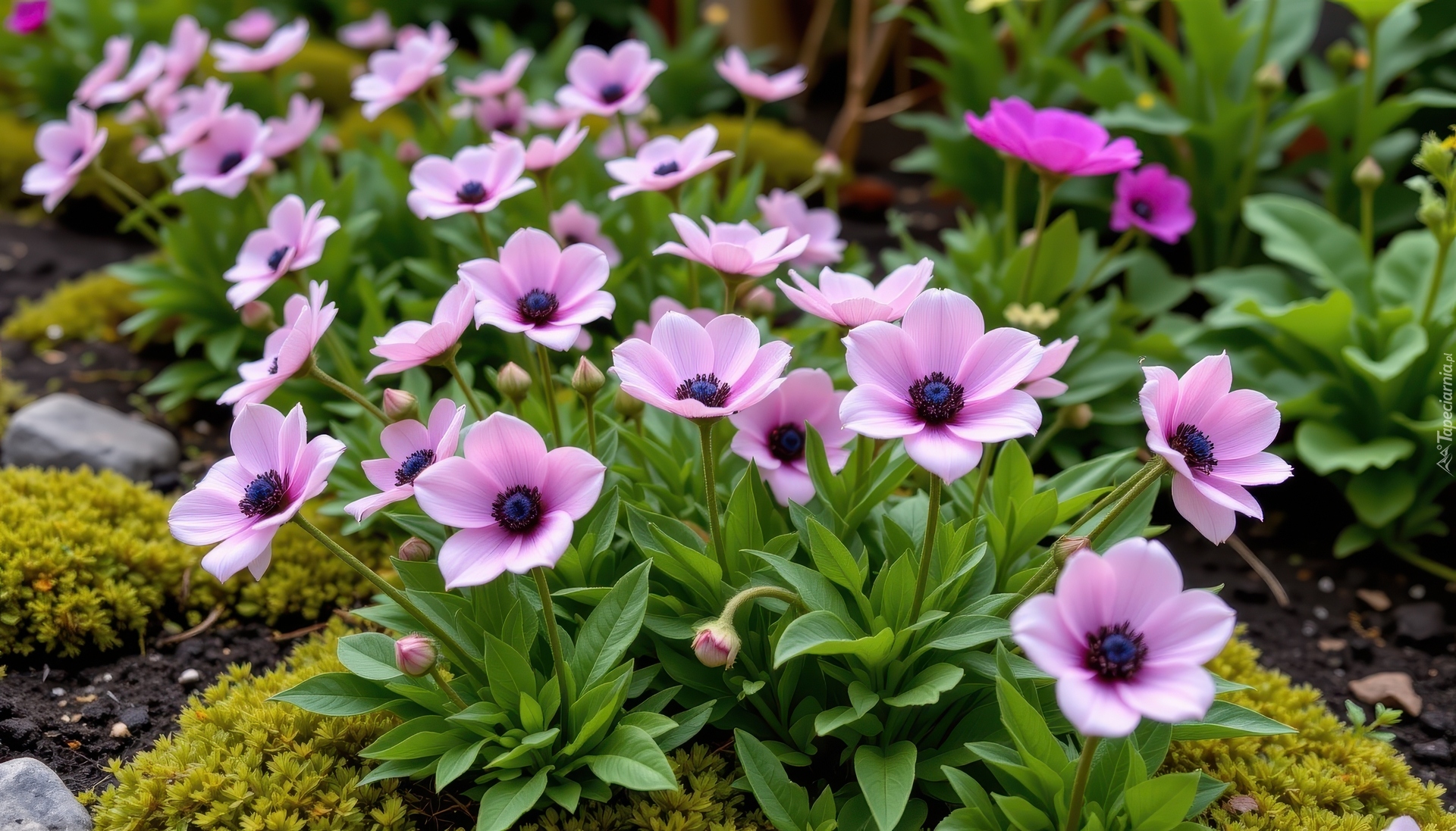 Edytor tapety: Jasnofioletowe zawilce na mchu w ogrodzie