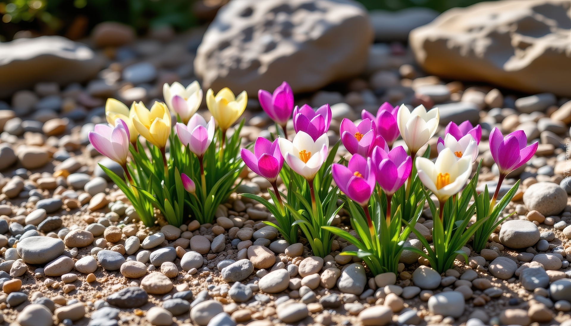Edytor tapety: Rozświetlone słońcem kolorowe krokusy na kamykach