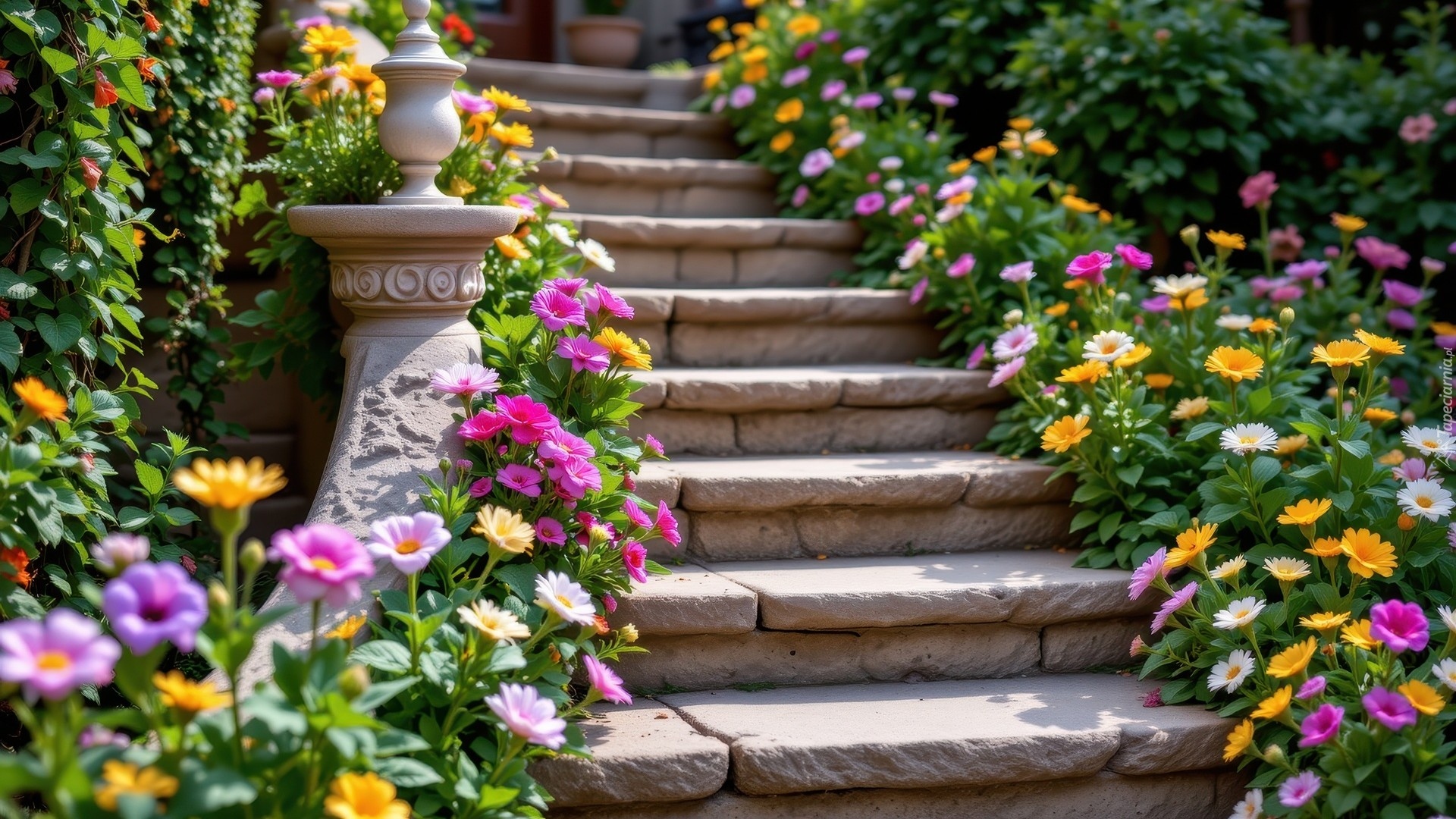 Edytor tapety: Kolorowe kwiaty przy schodach