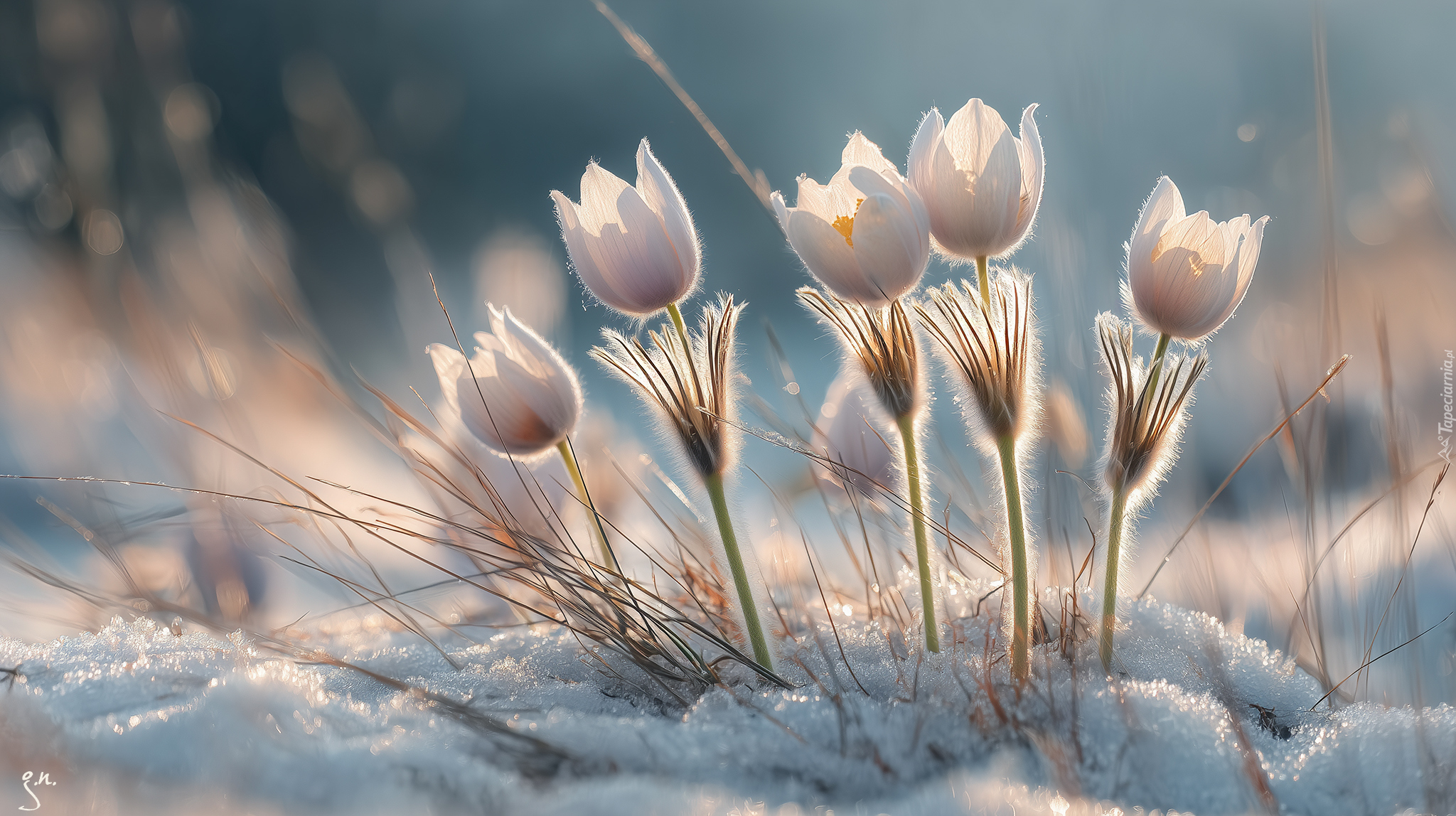 Edytor tapety: Rozświetlone sasanki w śniegu