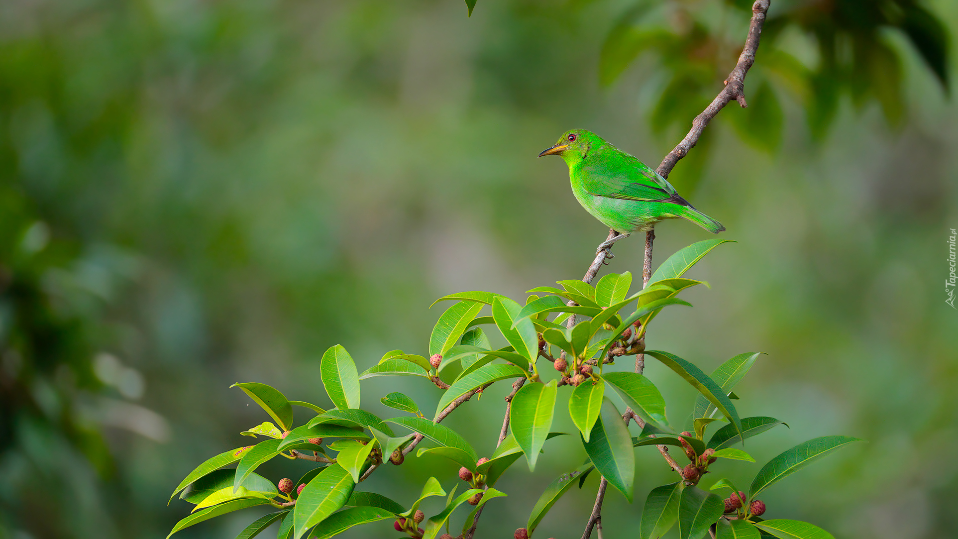 Edytor tapety: Zielona samica seledynka i liście na gałęzi