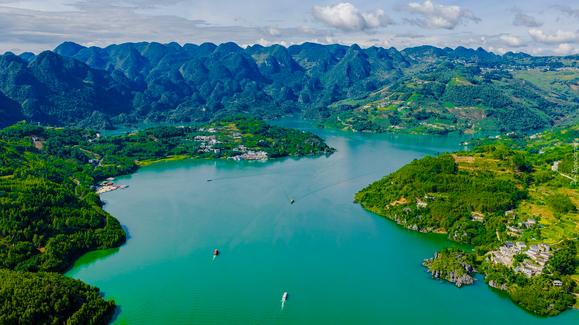 Edytor tapety: Widok z lotu ptaka na rzekę i góry